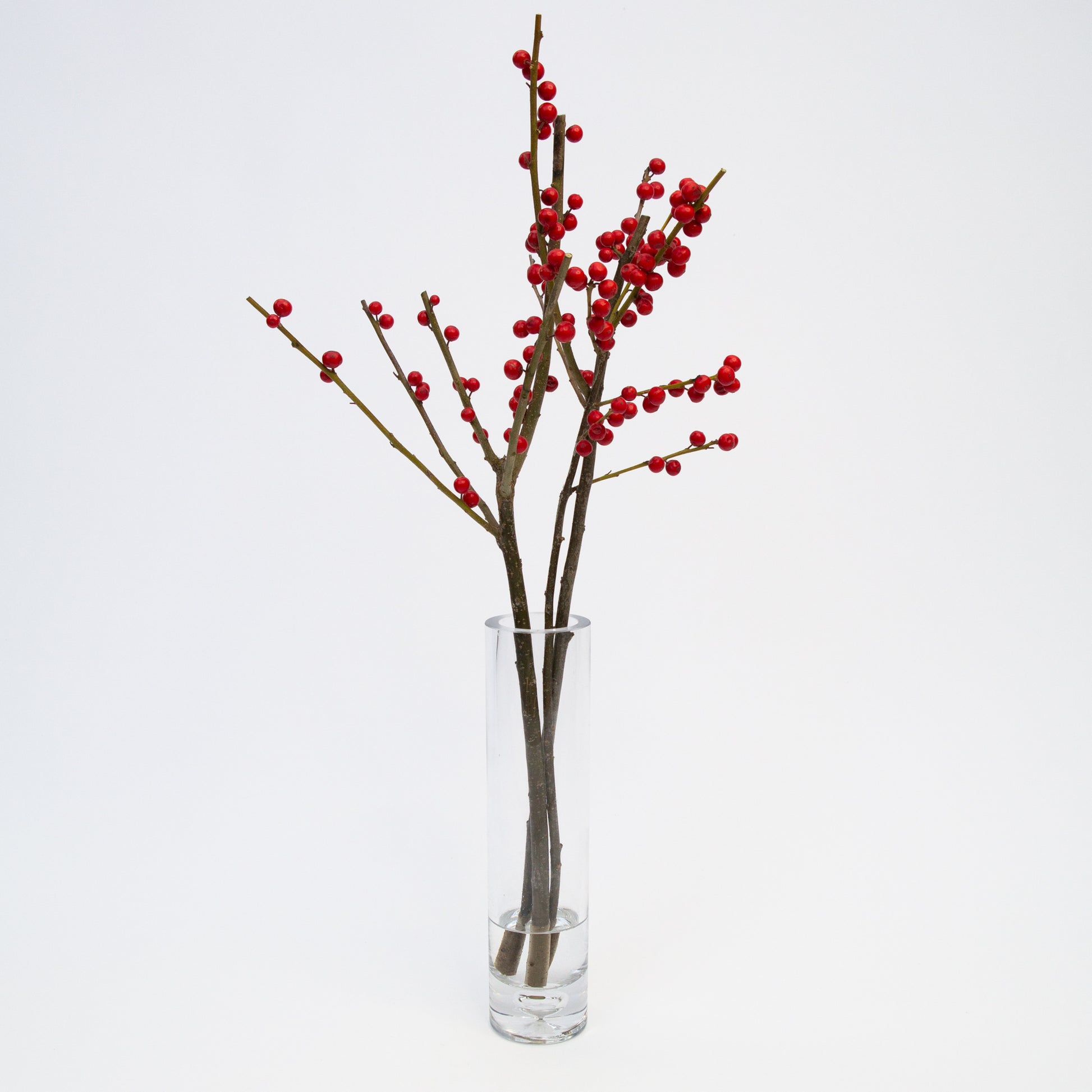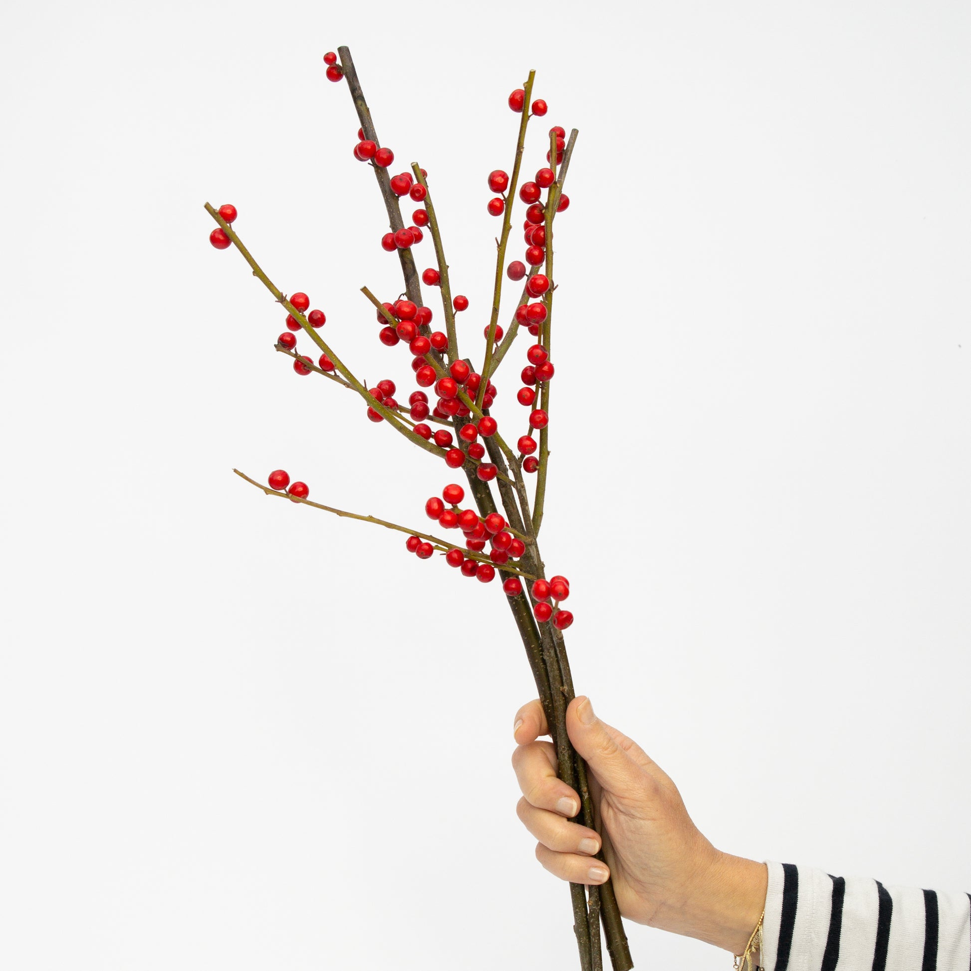 ענפי אילקס מרהיבים עם פירות אדומים, שמוסיפים צבע ונוכחות לכל סידור חורפי. אידיאליים לעיצובי שולחן מינימליסטים, אגרטלים צרים ומראה טבעי.