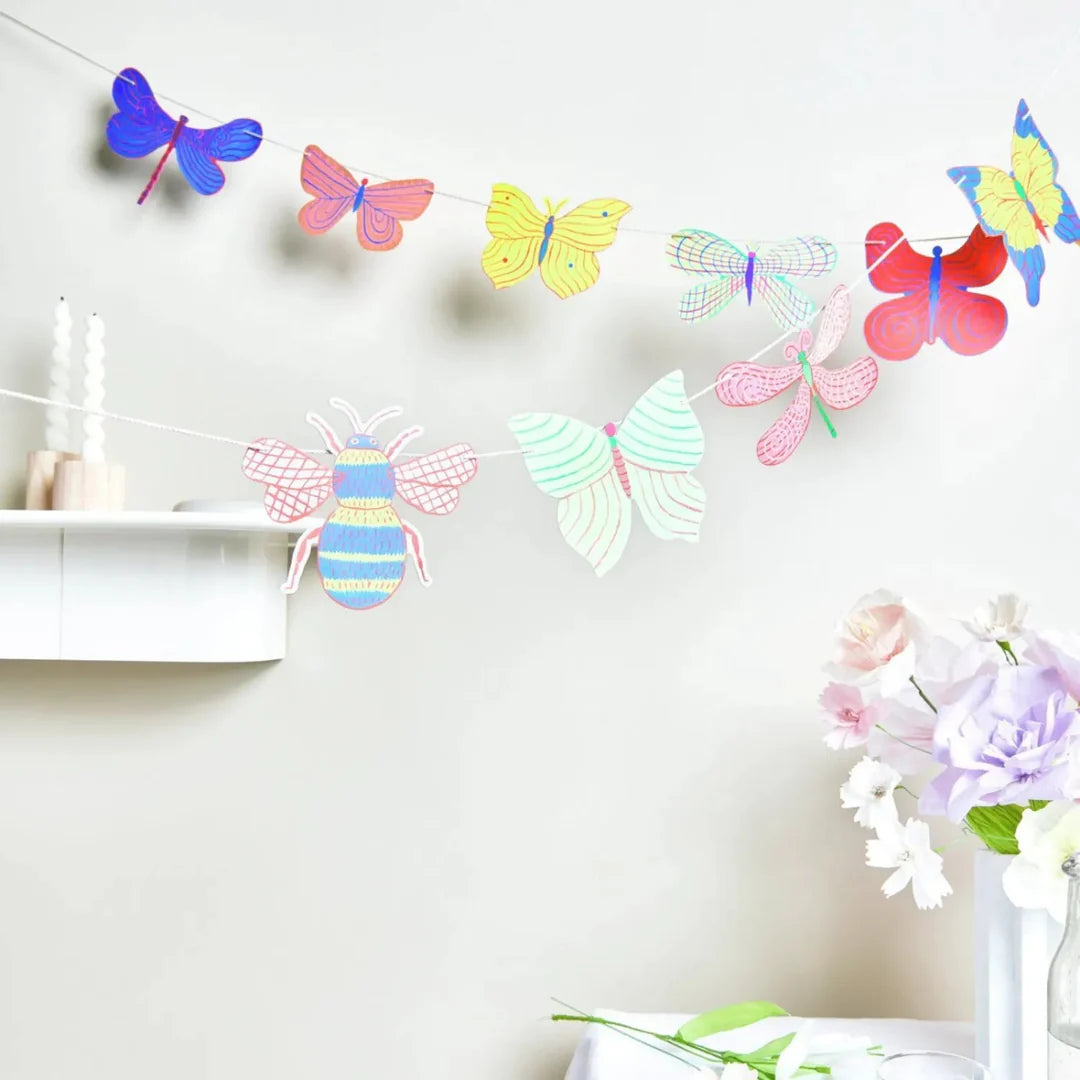 גרילנדה חגיגית ומעוצבת שמגיעה מפורקת להרכבה עצמית: המוצר כולל חבל כותנה דק באורך 3 מטרים וחיתוכי נייר בצורת חרקים צבעוניים שצריך להשחיל לחוט בעיצוב לבחירתך. הגרילנדה תהיה מושלמת כקישוט במסיבות או כחלק קבוע מעיצוב הבית או המשרד, והיא לגמרי מתאימה לשימוש חוזר. גם צבעונית וגם סביבתית!