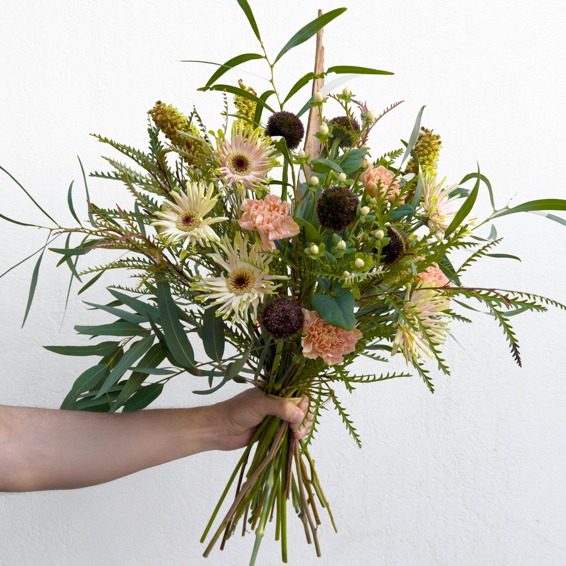 זר בסגנון חופשי הכולל גרברה פסטה, גרבילאה פורחת,