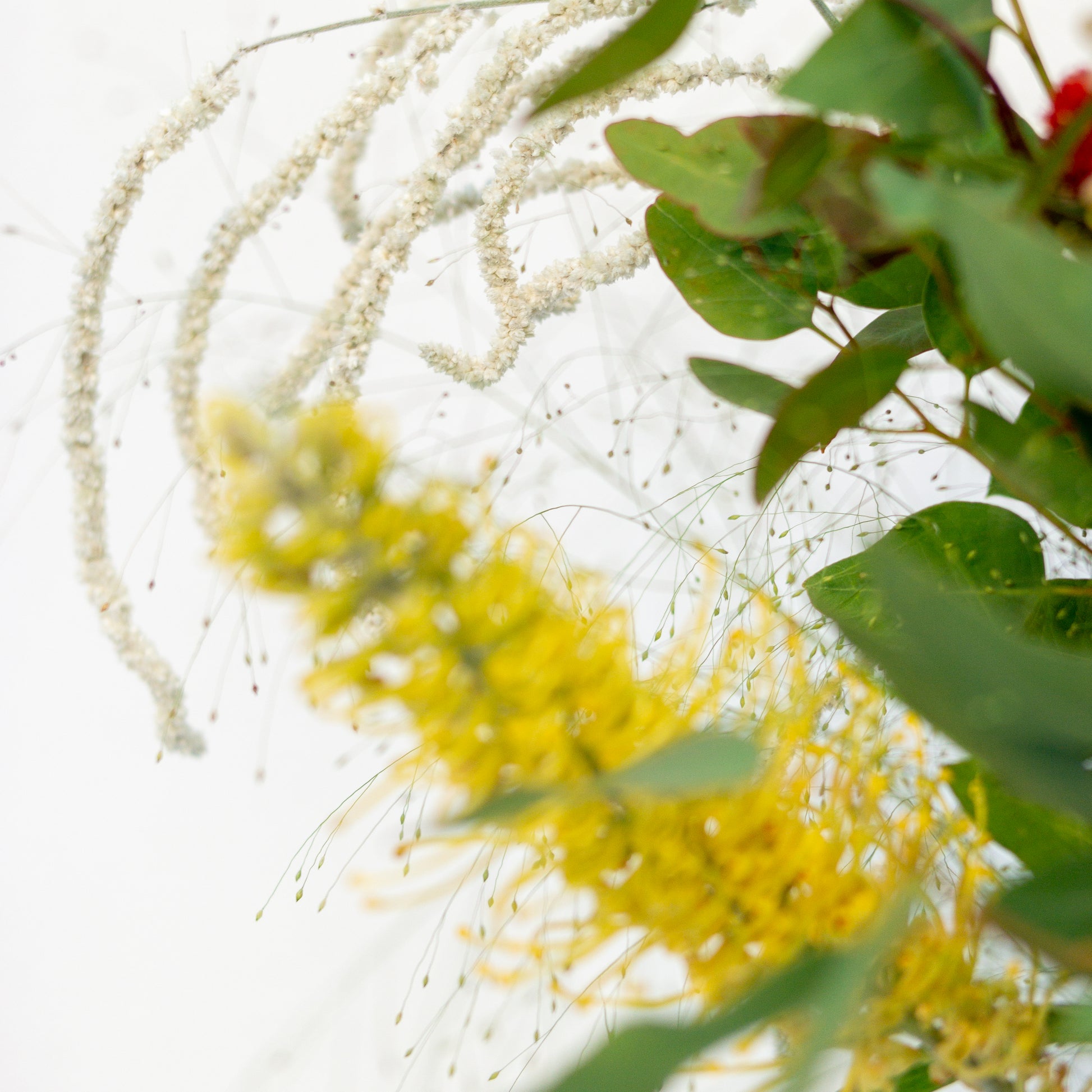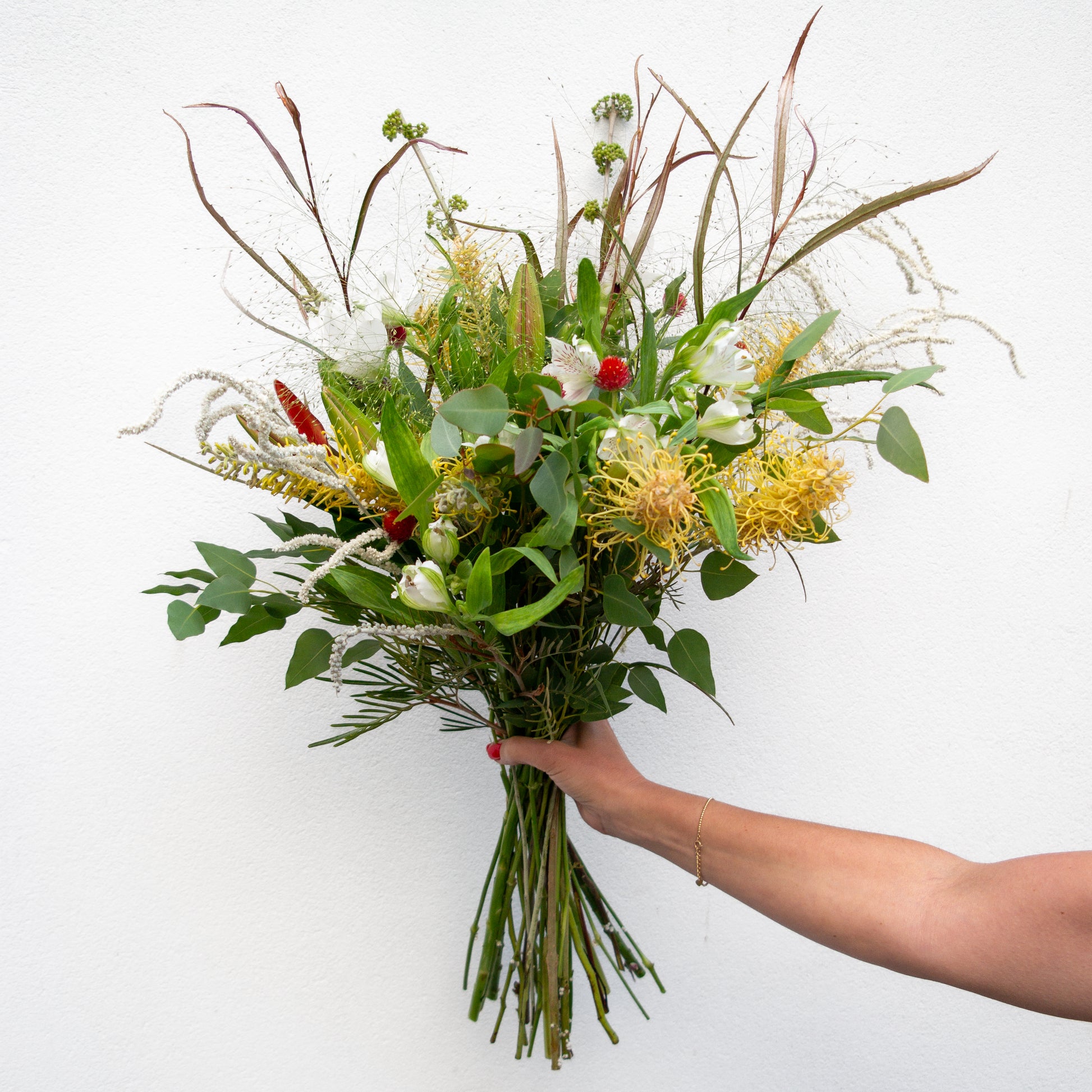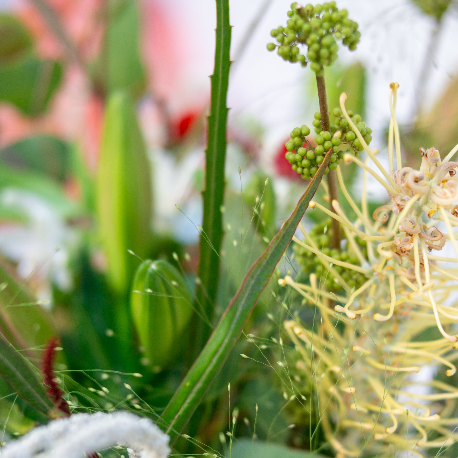 זר בסגנון חופשי הכולל גרבילאה פורחת, גומפרנה, אלסטרומריה, קורקומה, כיסופית, קליקרפה ושלל ירוקים