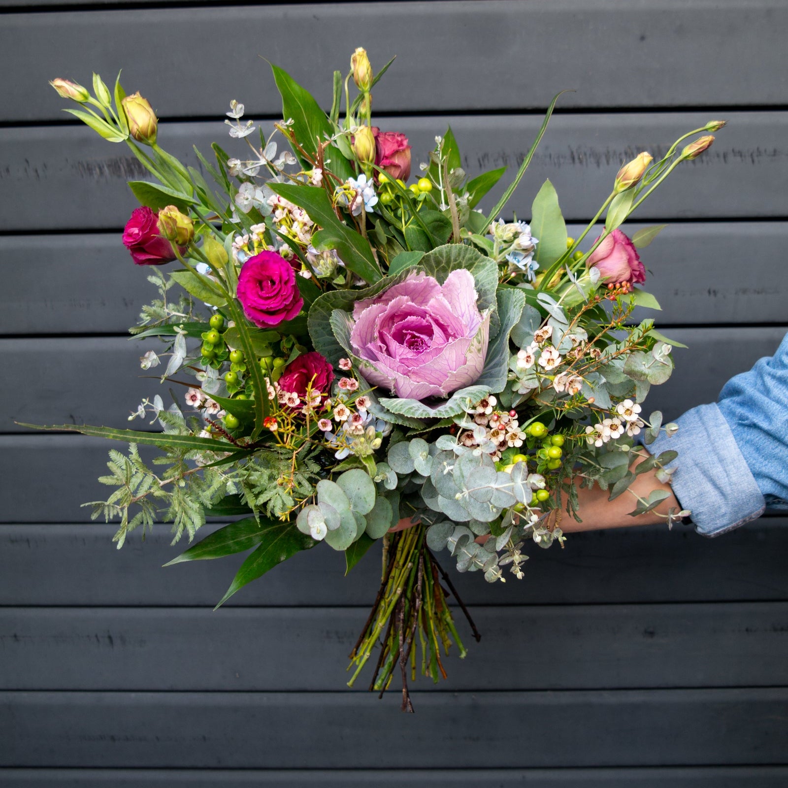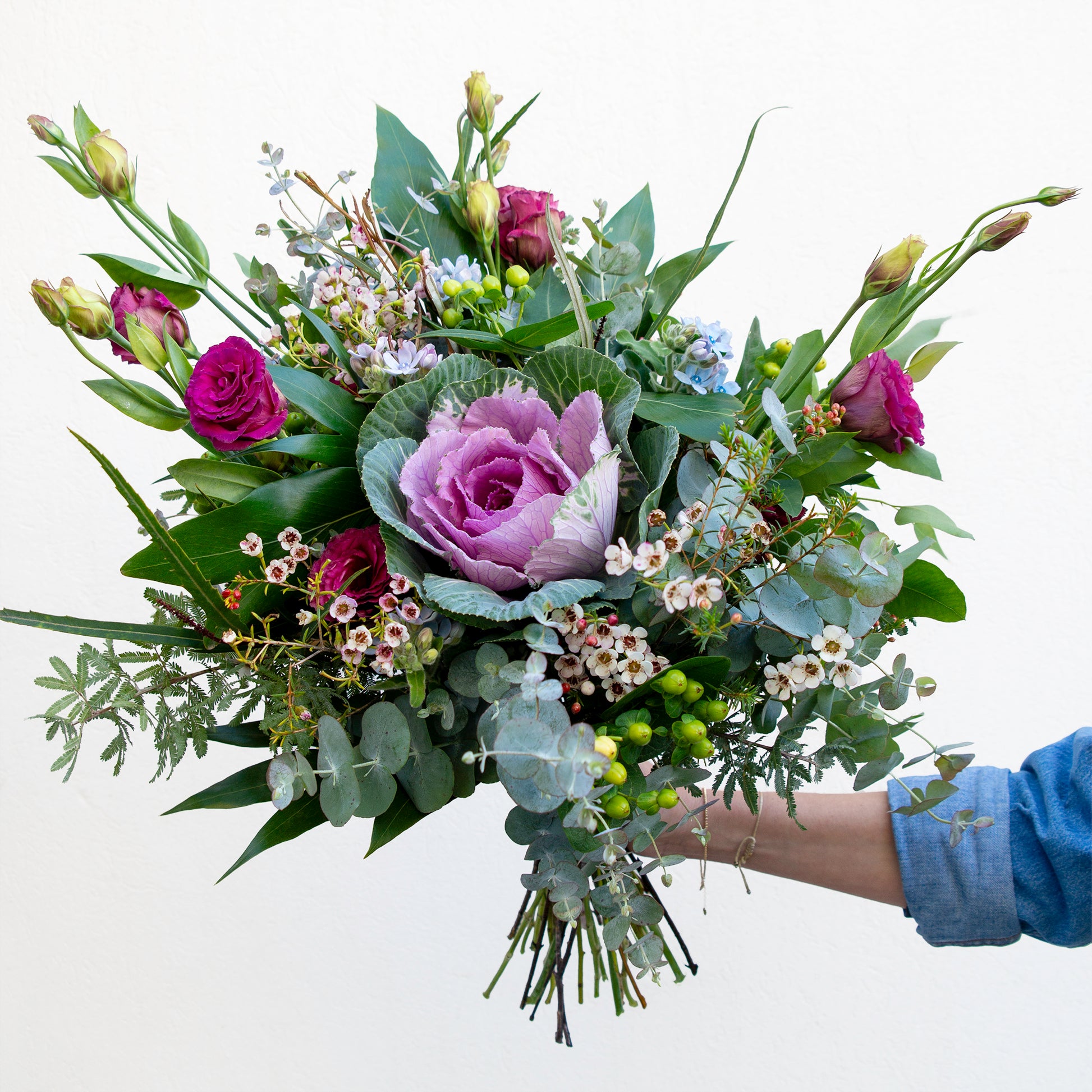 זר בסגנון חופשי הכולל כרוב נוי, ליזיאנטוס, טווידה, שעווה, היפריקום פינקי, אקציה ושלל ירוקים