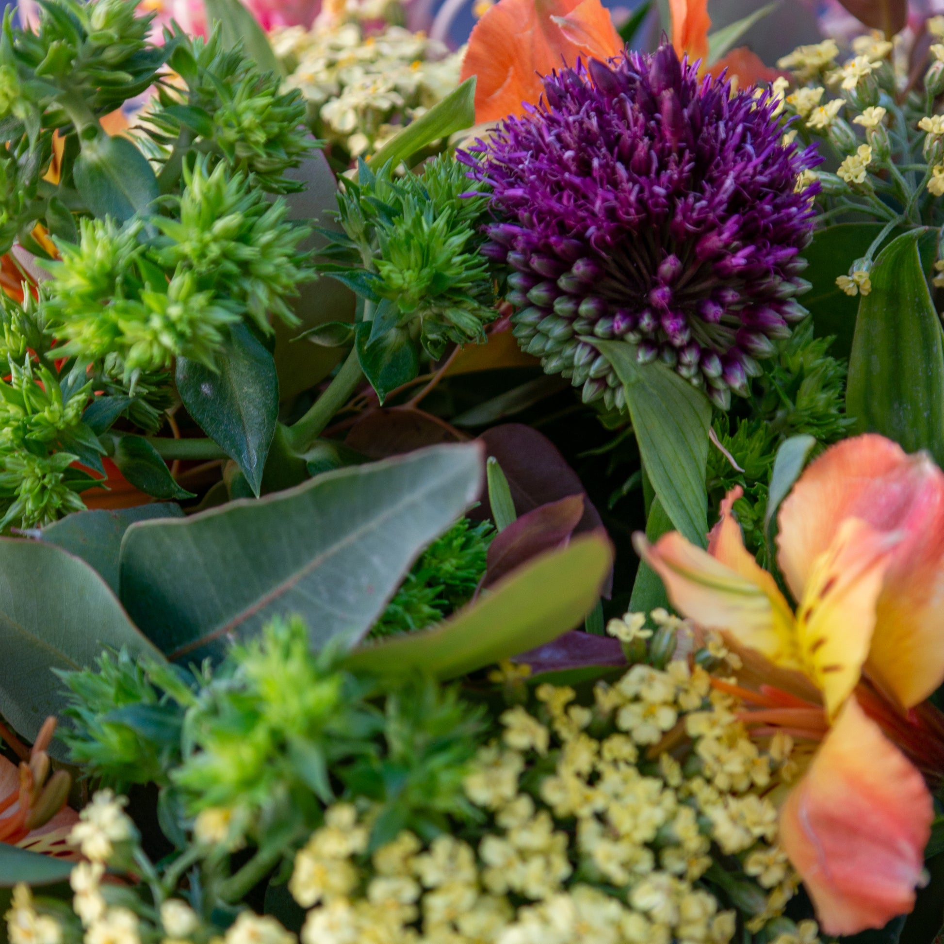 זר בסגנון חופשי הכולל פרח שום סגול, אלסטרומריה, אכילאה, פלוקס, גרבילאה פורחת ואקליפטוס