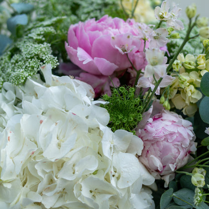 זר בסגנון חופשי הכולל הורטנזיה, פיוני, מנתור, דולפיניום, אמיתה ואקליפטוס פרובלנטה