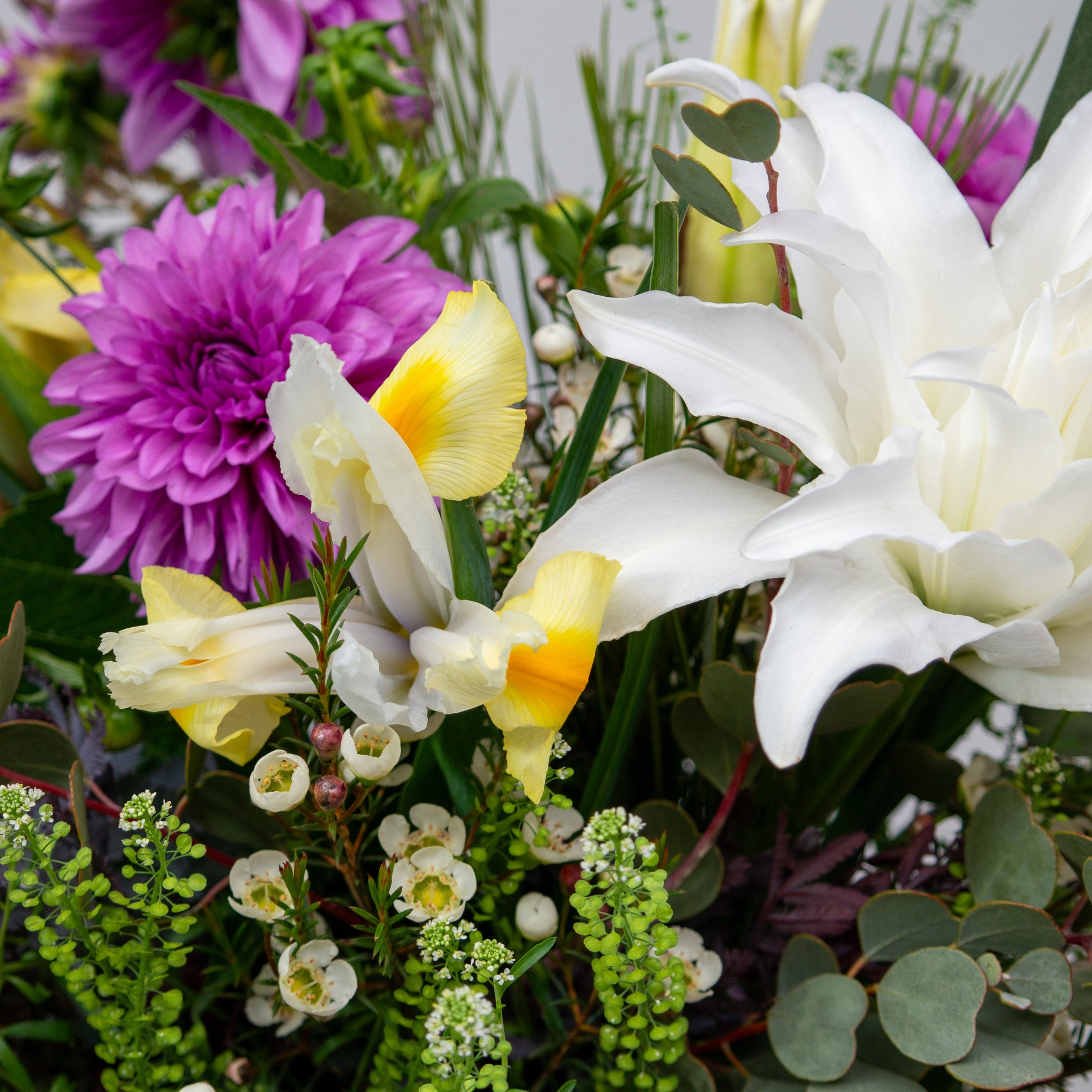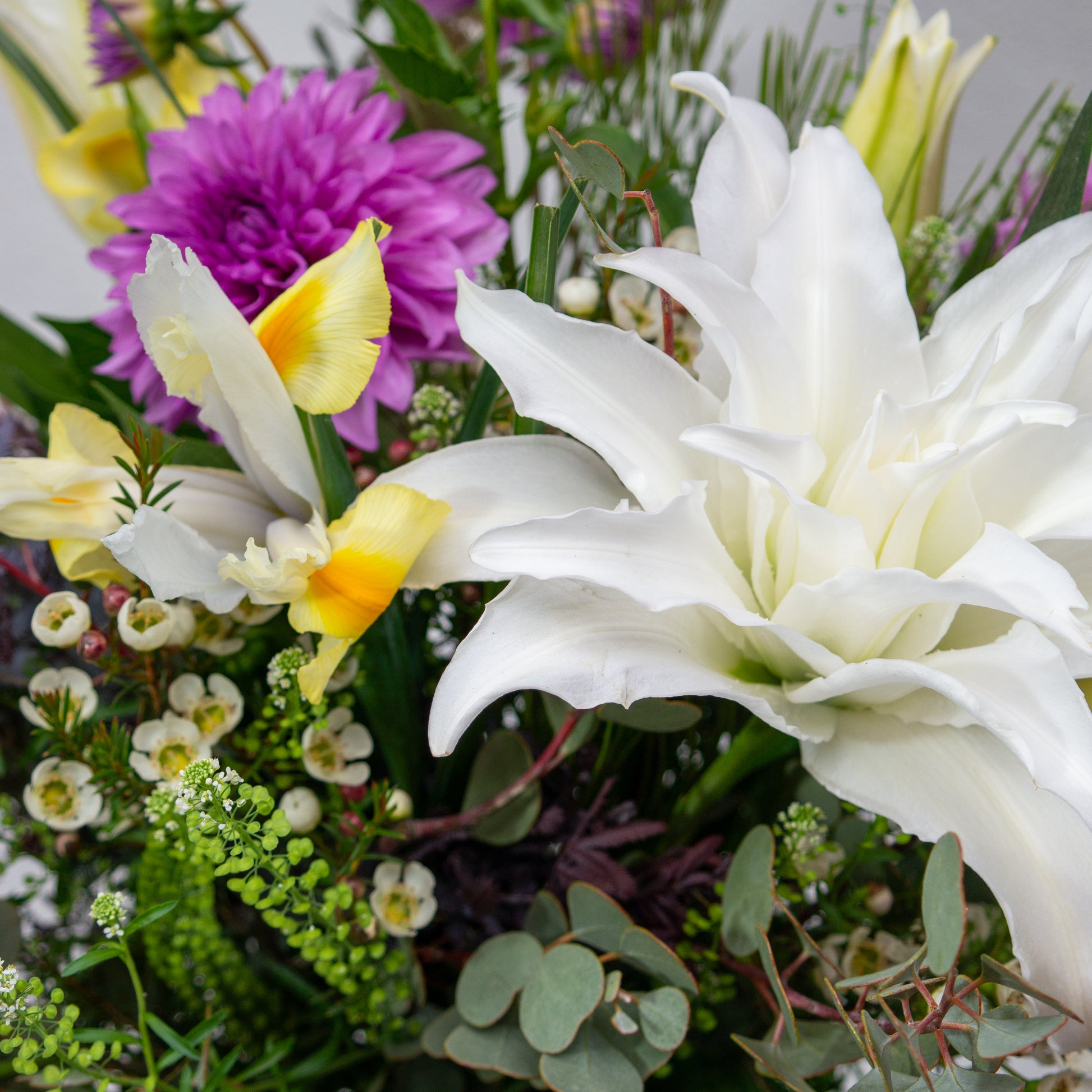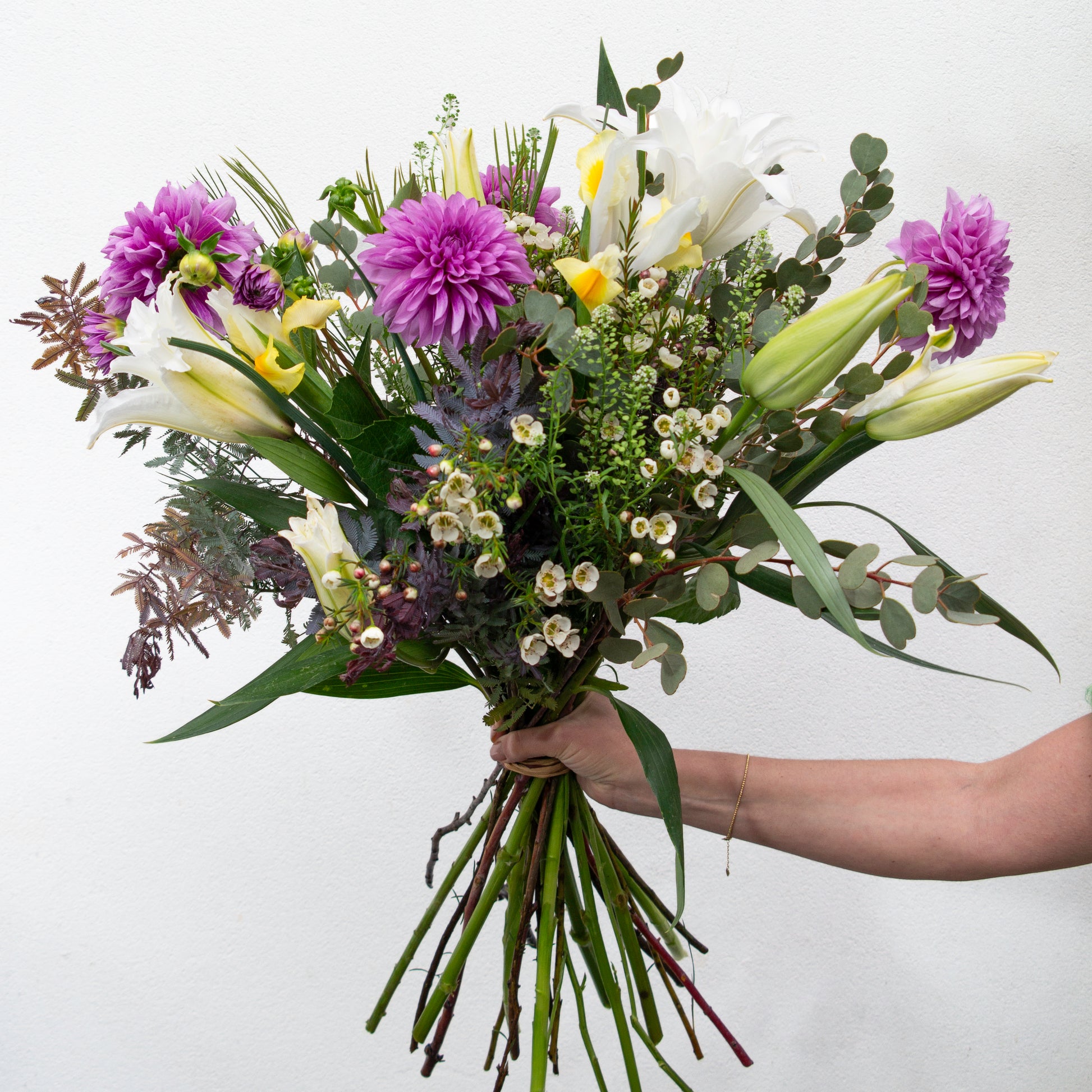 זר בסגנון חופשי הכולל שושן אוריינטלי כפול, דליה, איריס, שעווה, עופרים, אקציה, אקליפטוס, וגרבילאה עלים