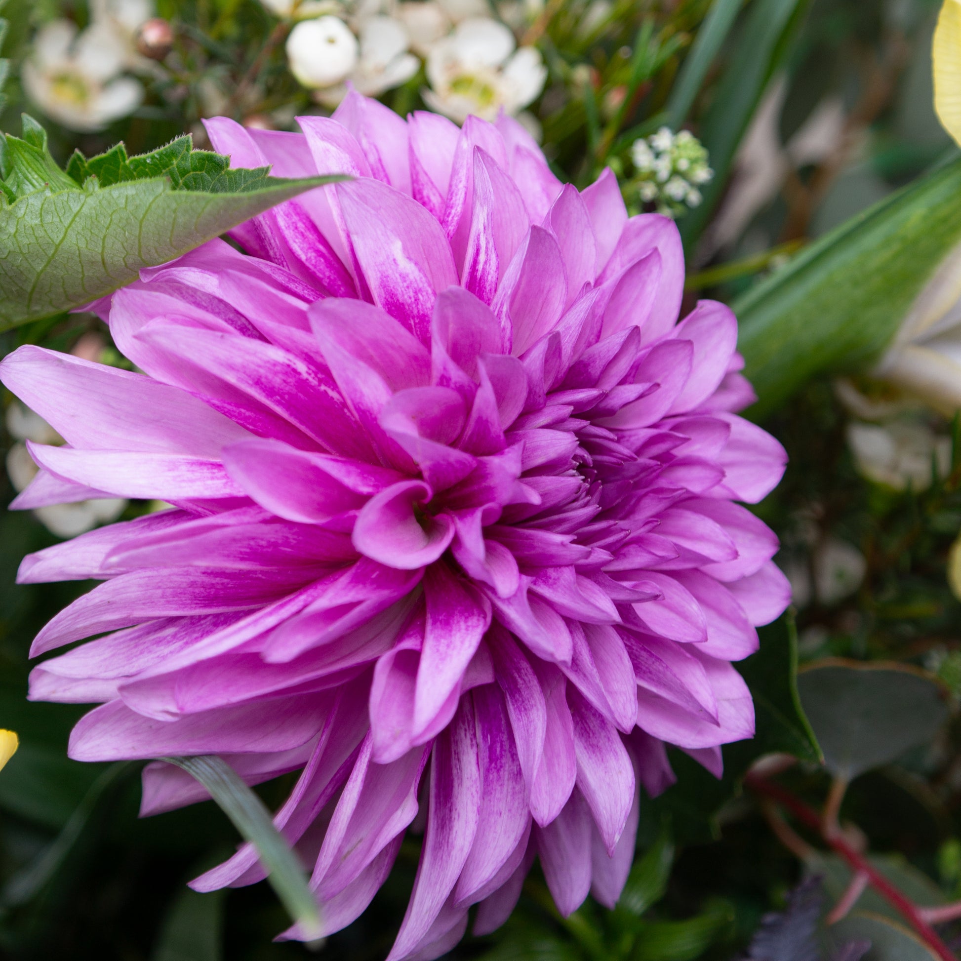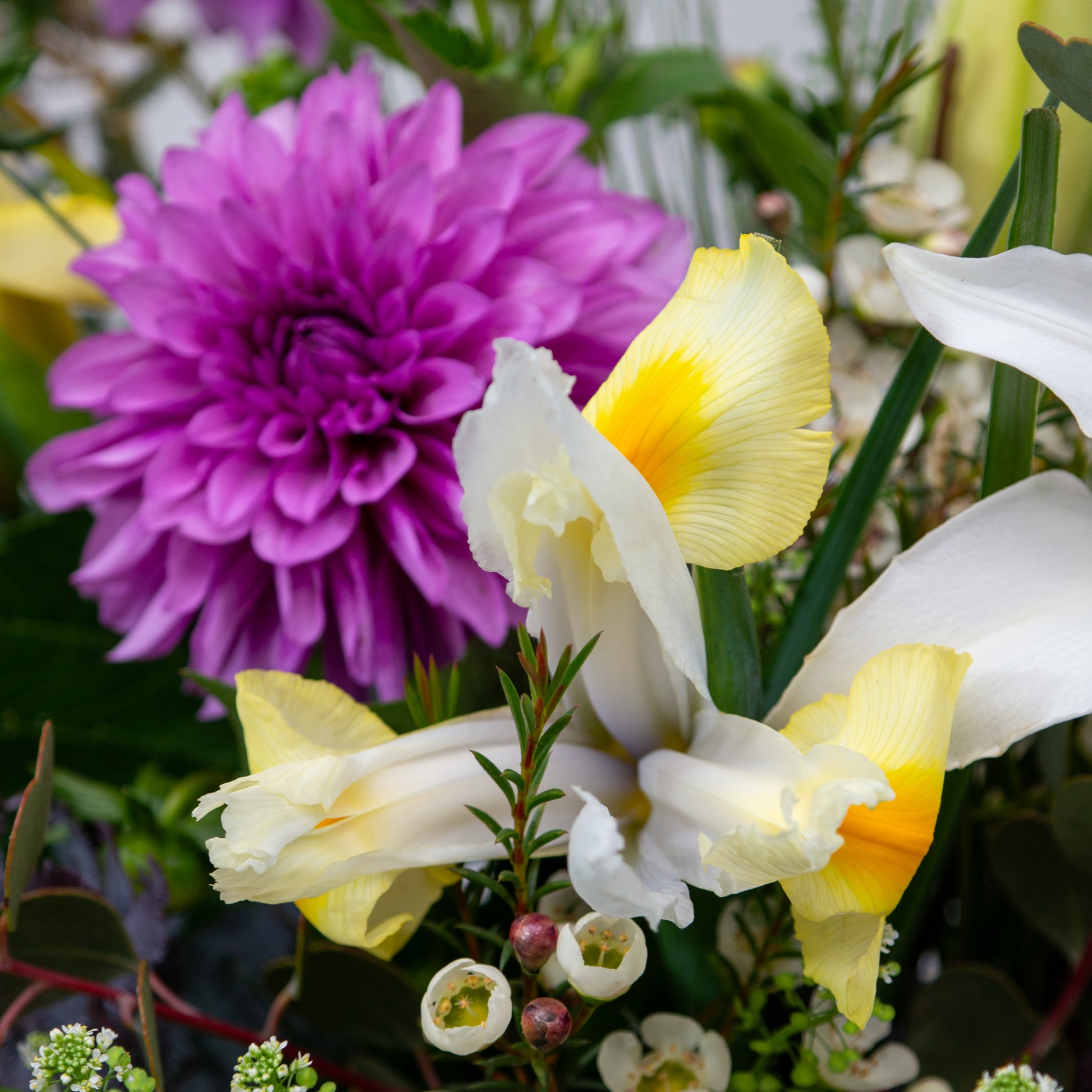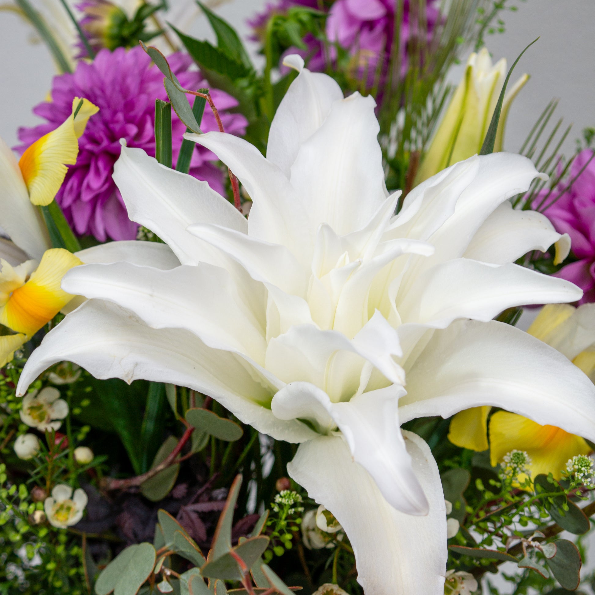 זר בסגנון חופשי הכולל שושן אוריינטלי כפול, דליה, איריס, שעווה, עופרים, אקציה, אקליפטוס, וגרבילאה עלים