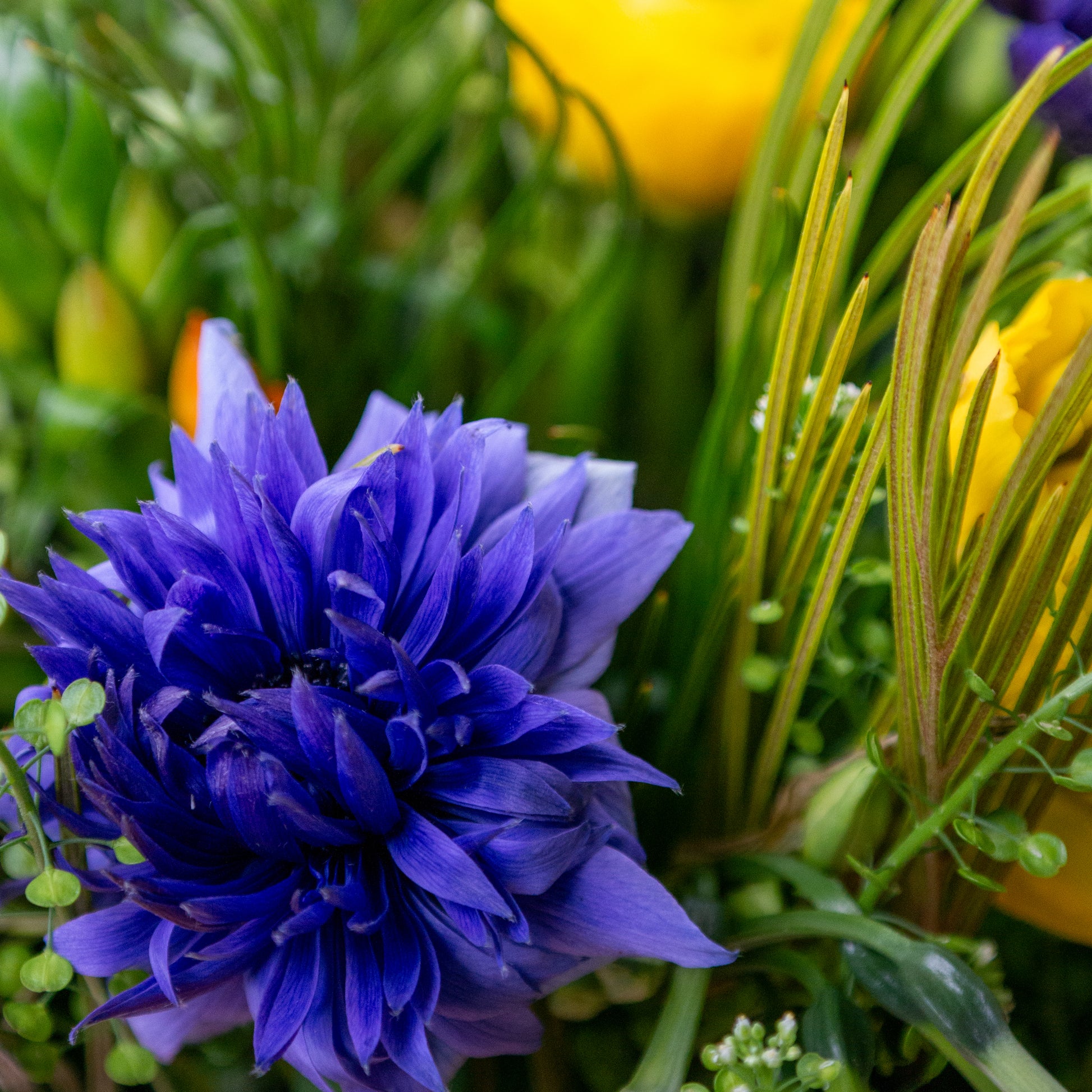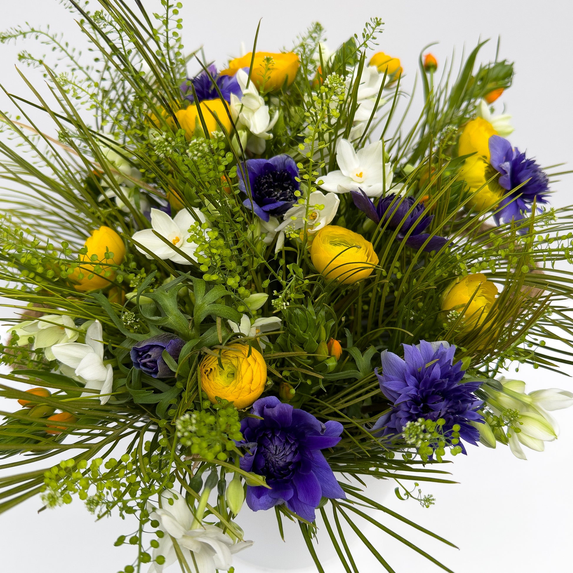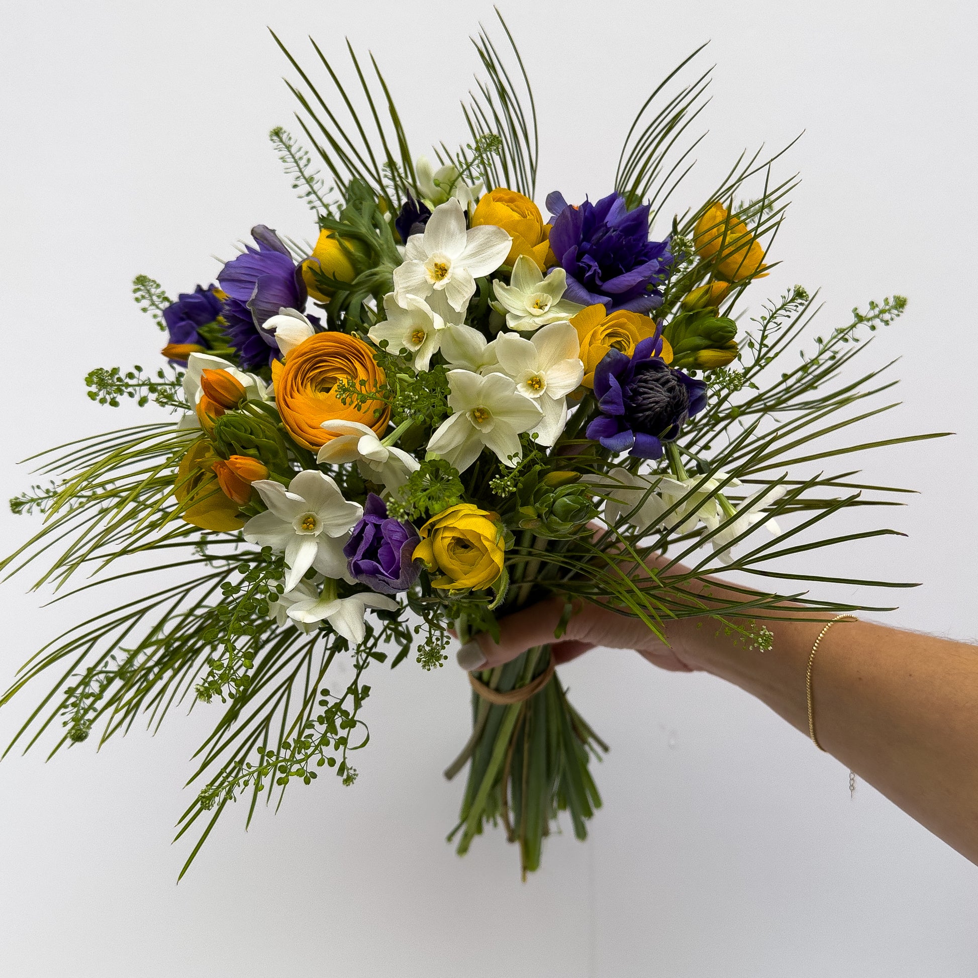 זר בסגנון חופשי הכולל נוריות, כלניות פולסטאר, נרקיסים, עופרים, נץ חלב, גרבילאה עלים, ושלל ירוקים