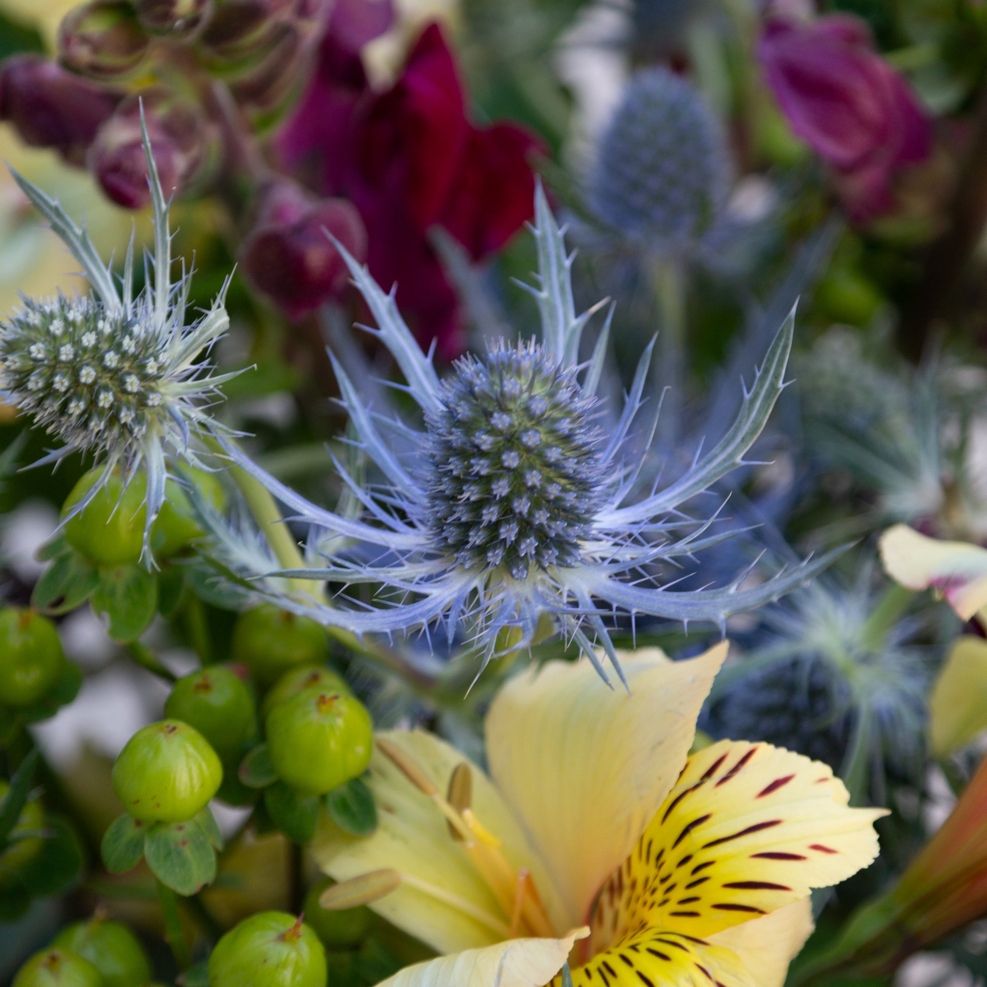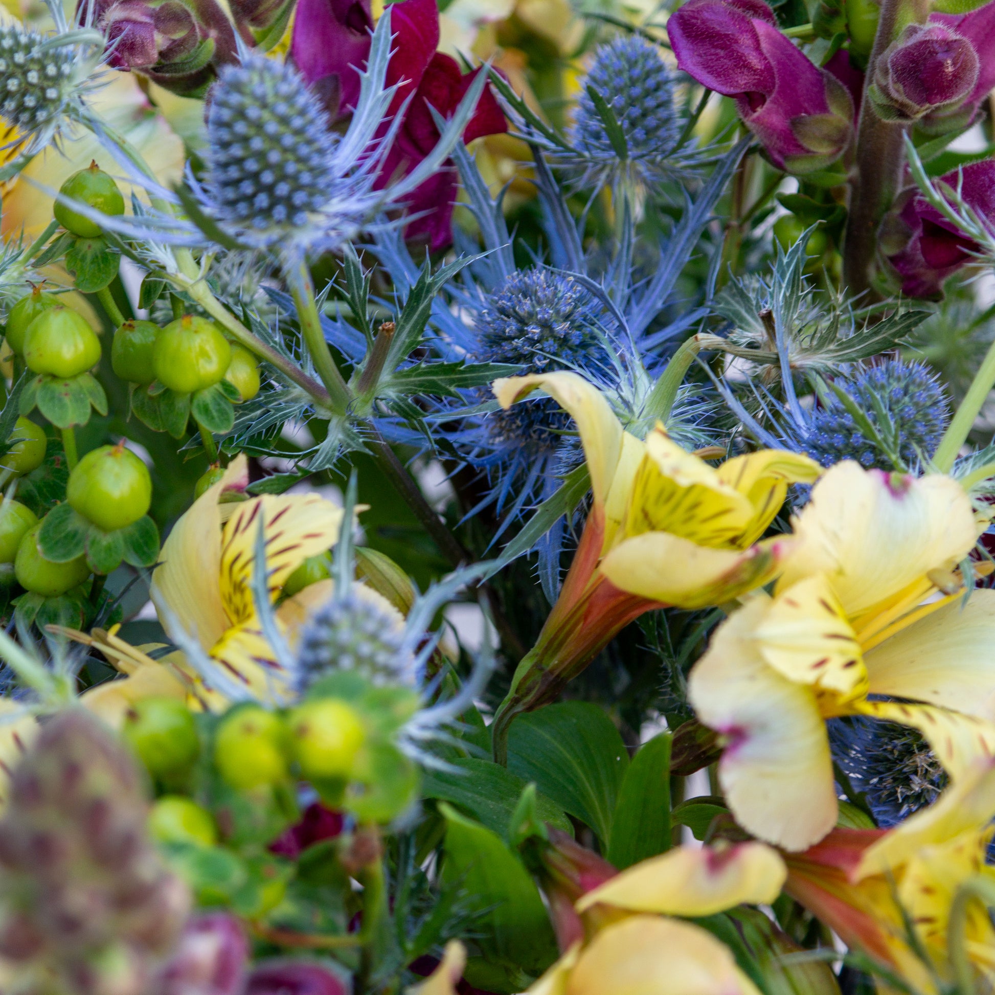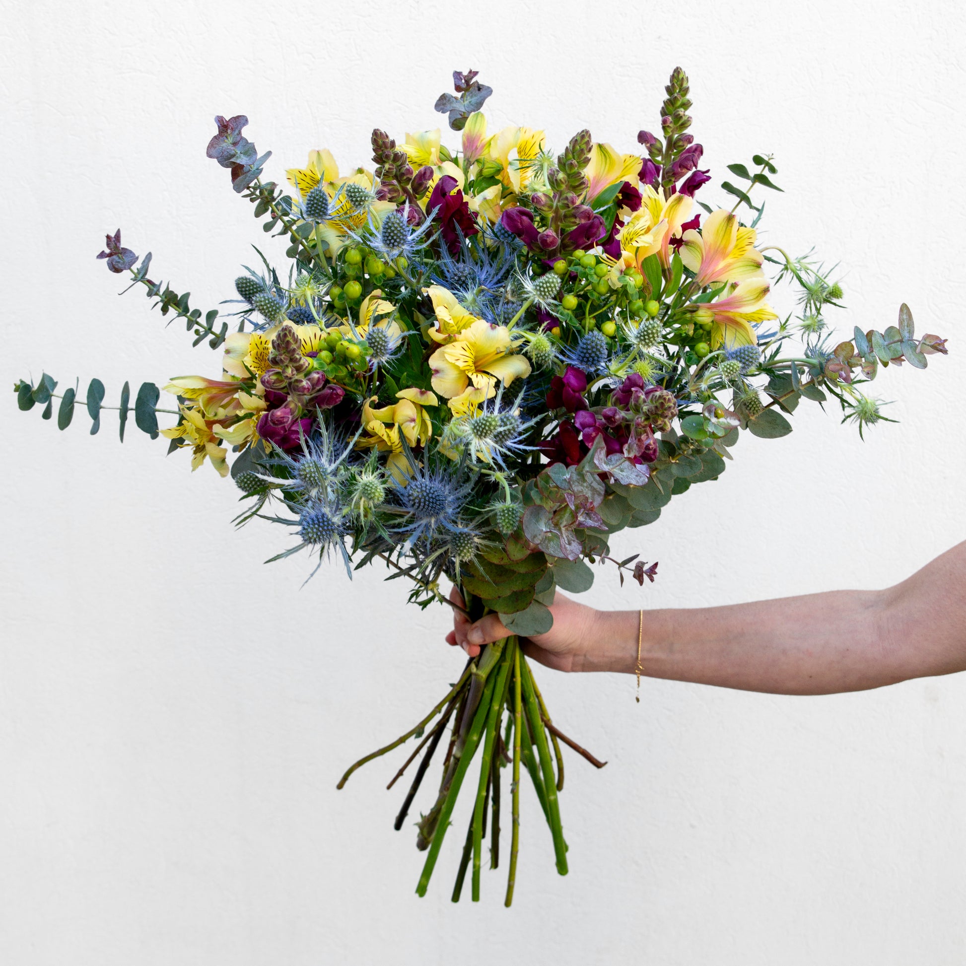 זר בסגנון חופשי הכולל אלסטרומריה, אירינגיום, לוע הארי, היפריקום פינקי ואקליפטוס