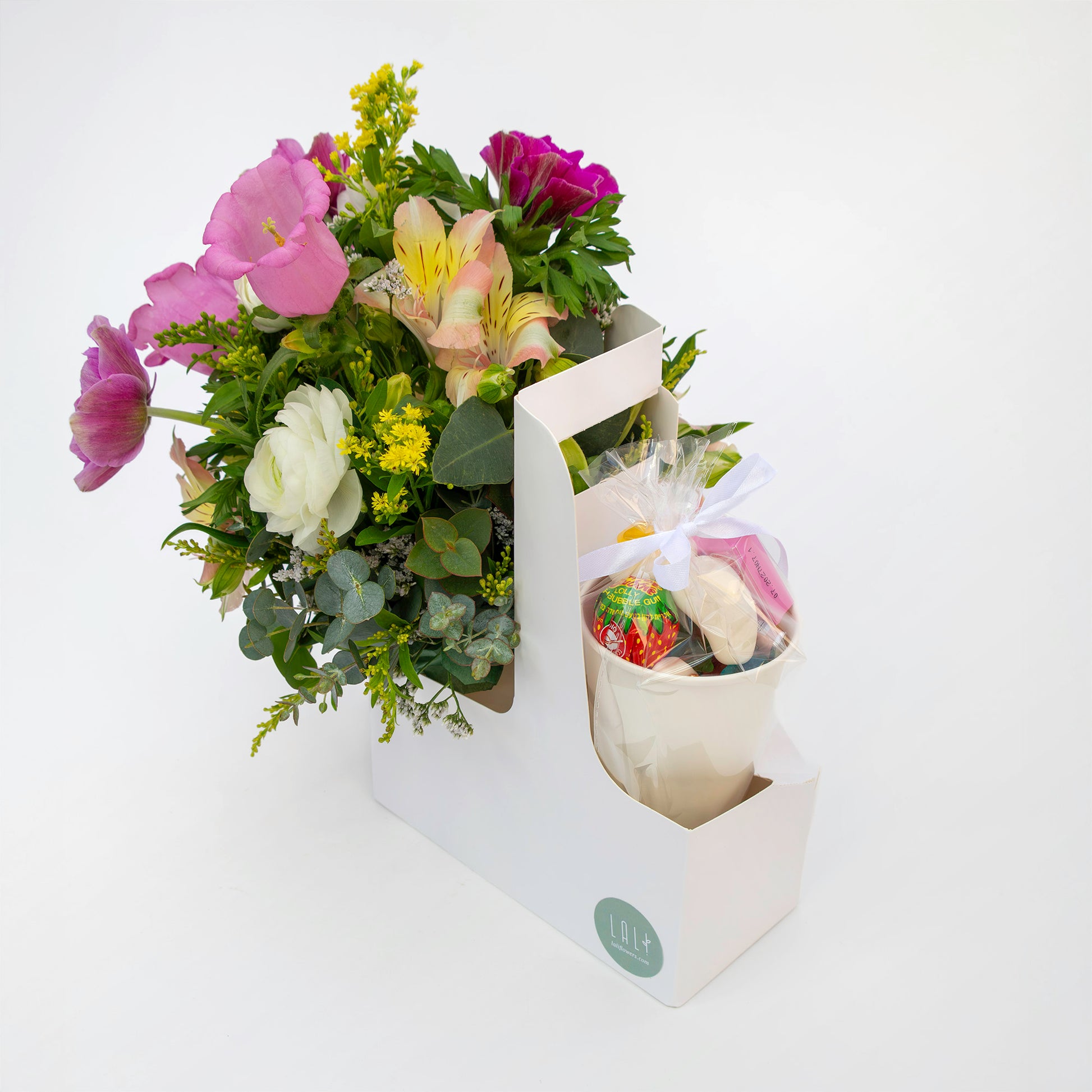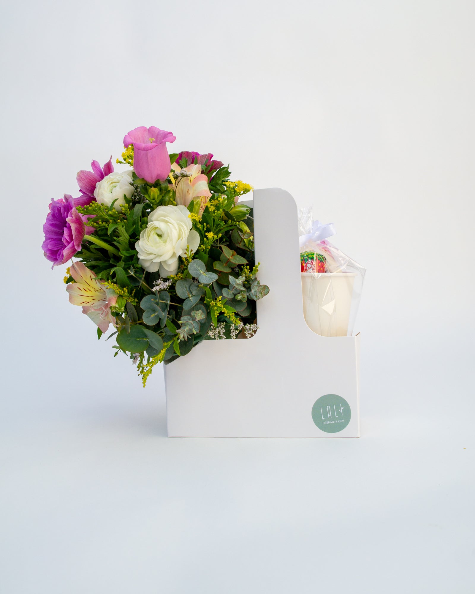 מארז קטן ומשמח המשלב זר פרחים טרי עם כוס סוכריות גומי צבעוניות. הפרחים מסודרים בעבודת יד ומוגשים במנשא קרטון פשוט ונוח לנשיאה, ולצידם כוס סוכריות עטופה בצלופן.