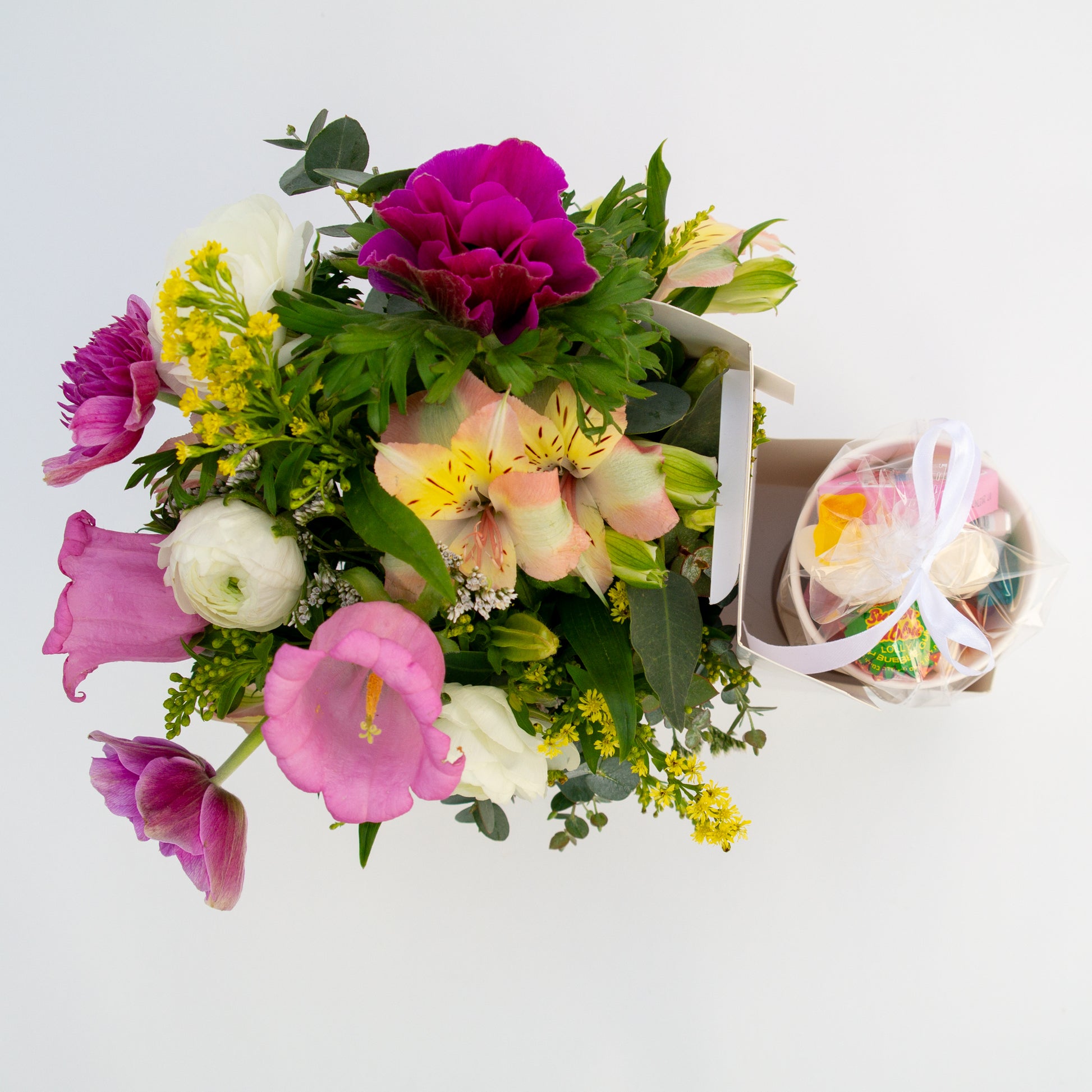 שילוב עדין בין פרחים רעננים למתיקות צבעונית – מחווה קלילה שמעלה חיוך ומתאימה לרגעים קטנים של תשומת לב.