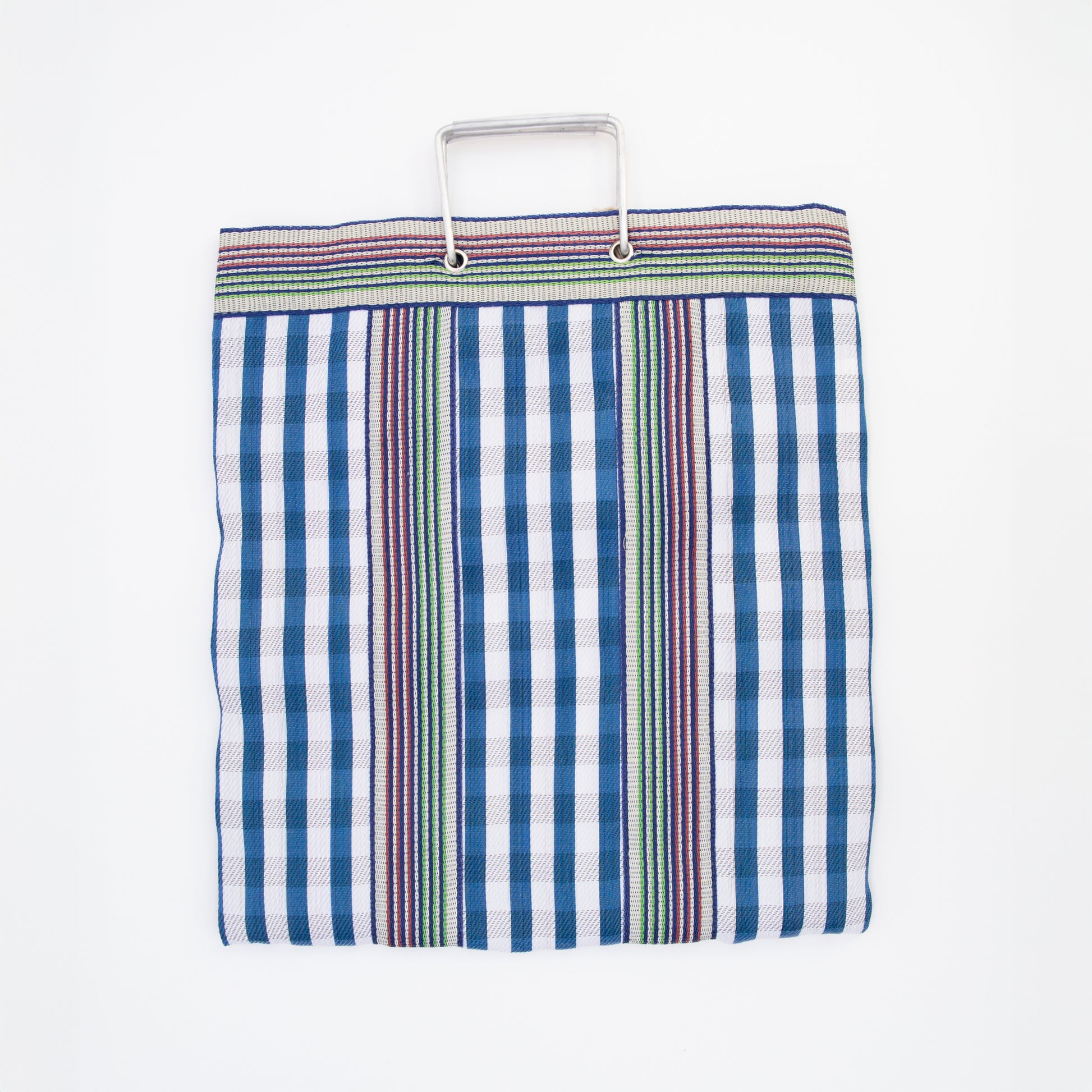תיק בד בעיצוב משובץ עם פסים בגווני כחול – שילוב נעים של צבע, טקסטורה וסטייל יומיומי. תיק קל ונוח לנשיאה, עם ידיות מתכת חזקות המוסיפות מראה נקי ומודרני.