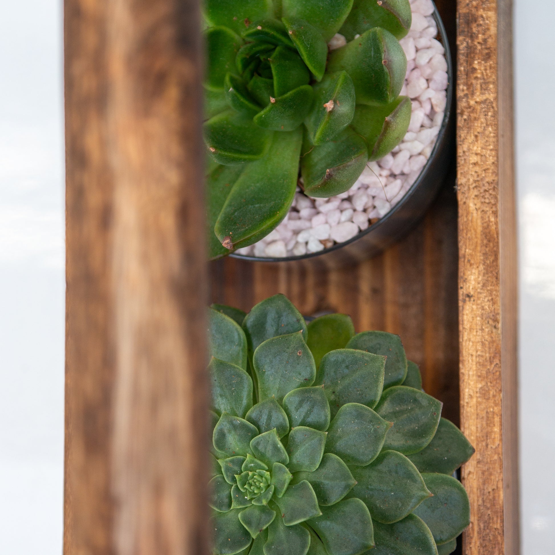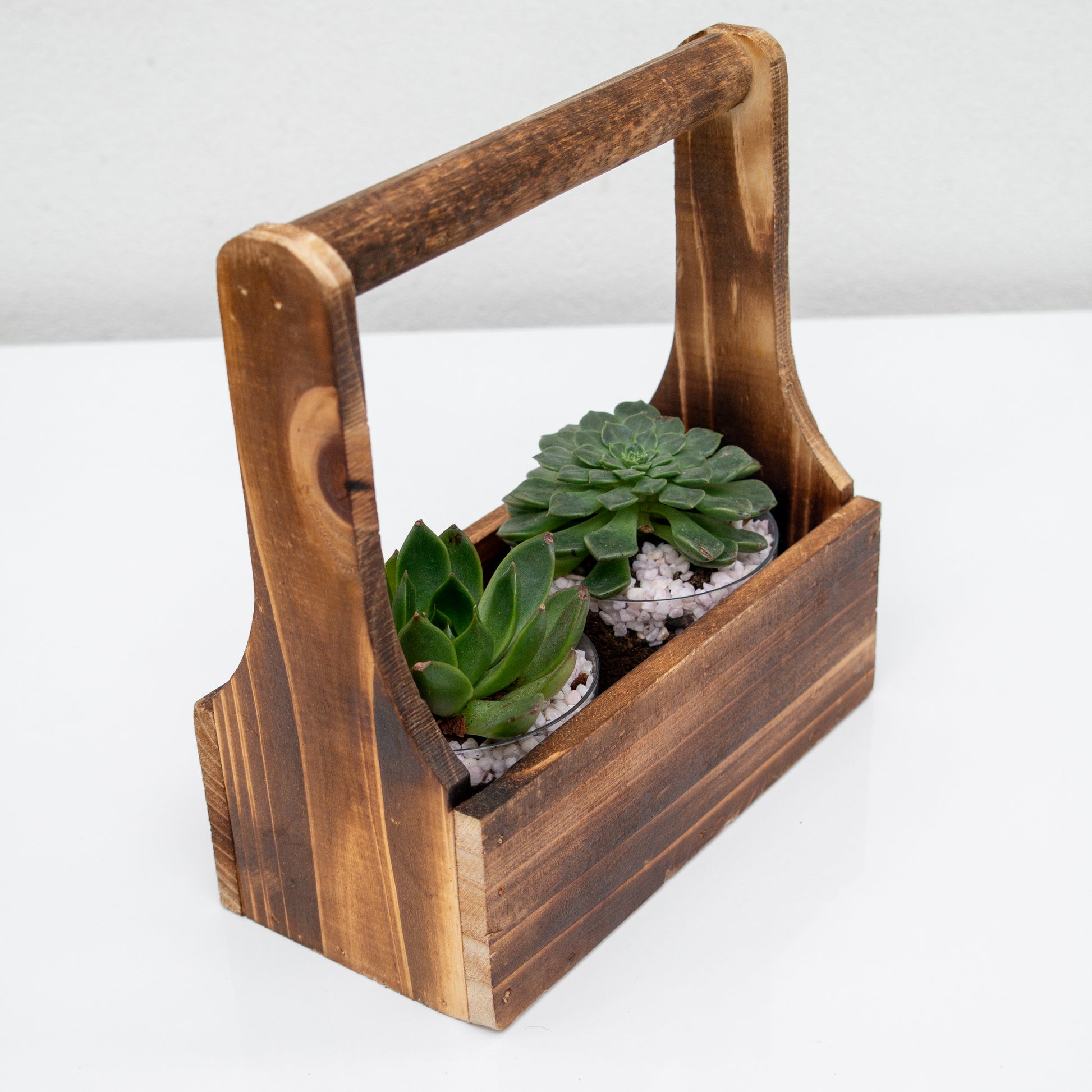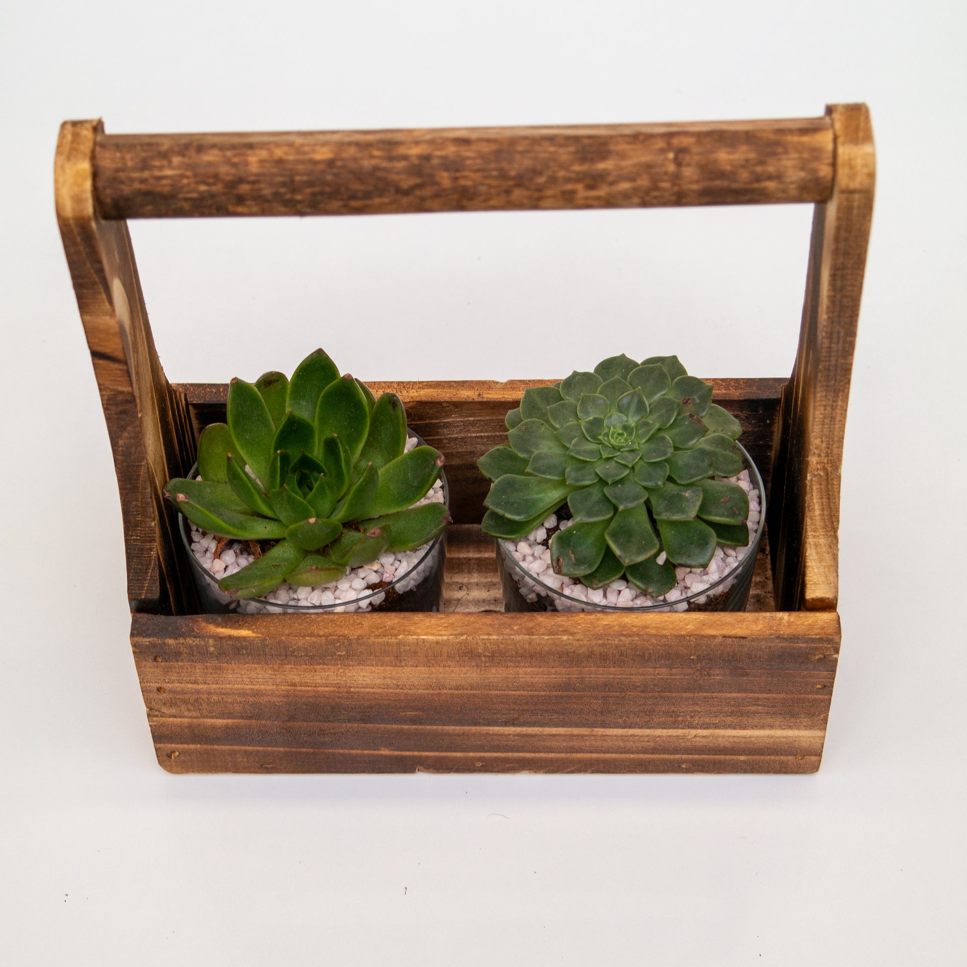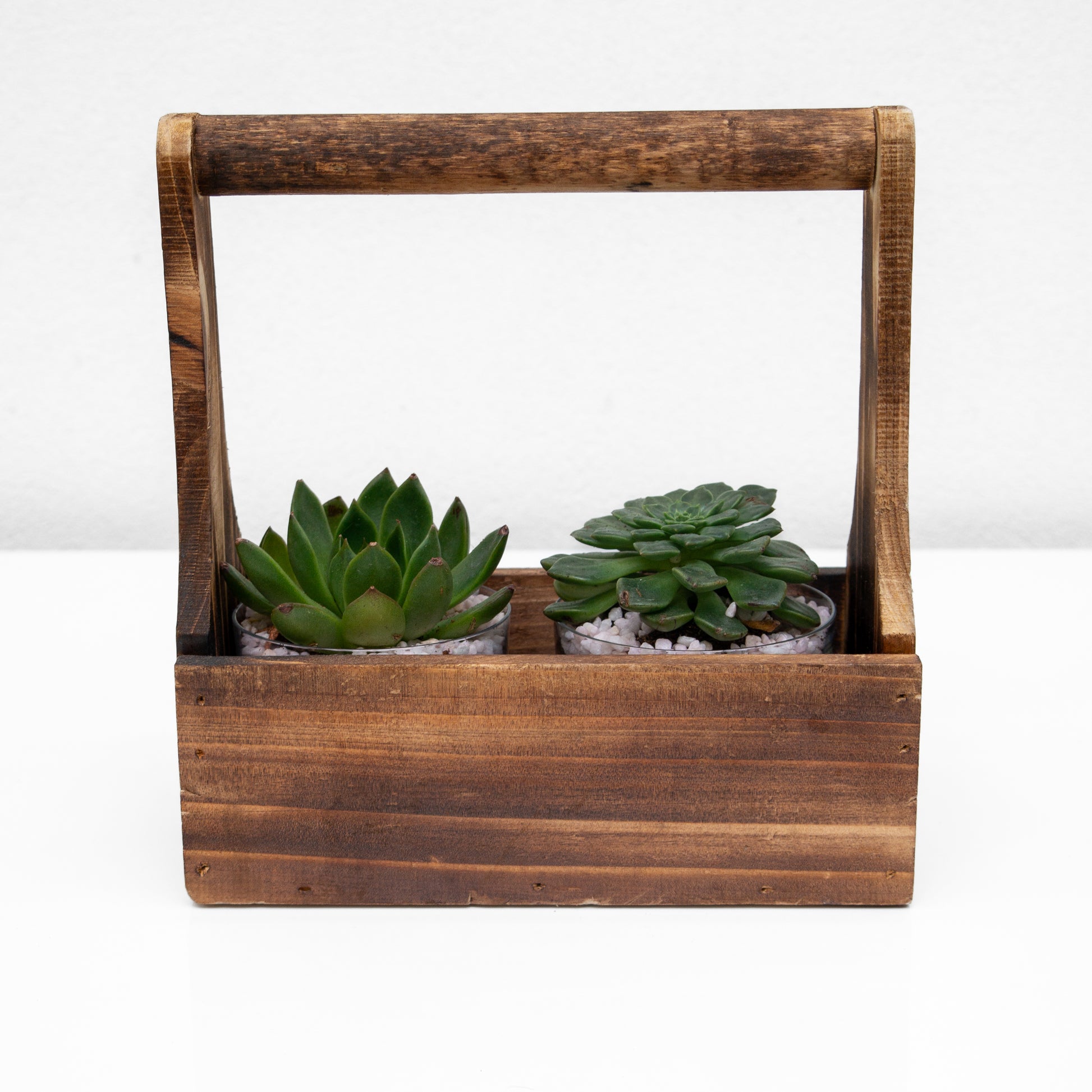 שני סקולנטים בכלי זכוכית במנשא עץ