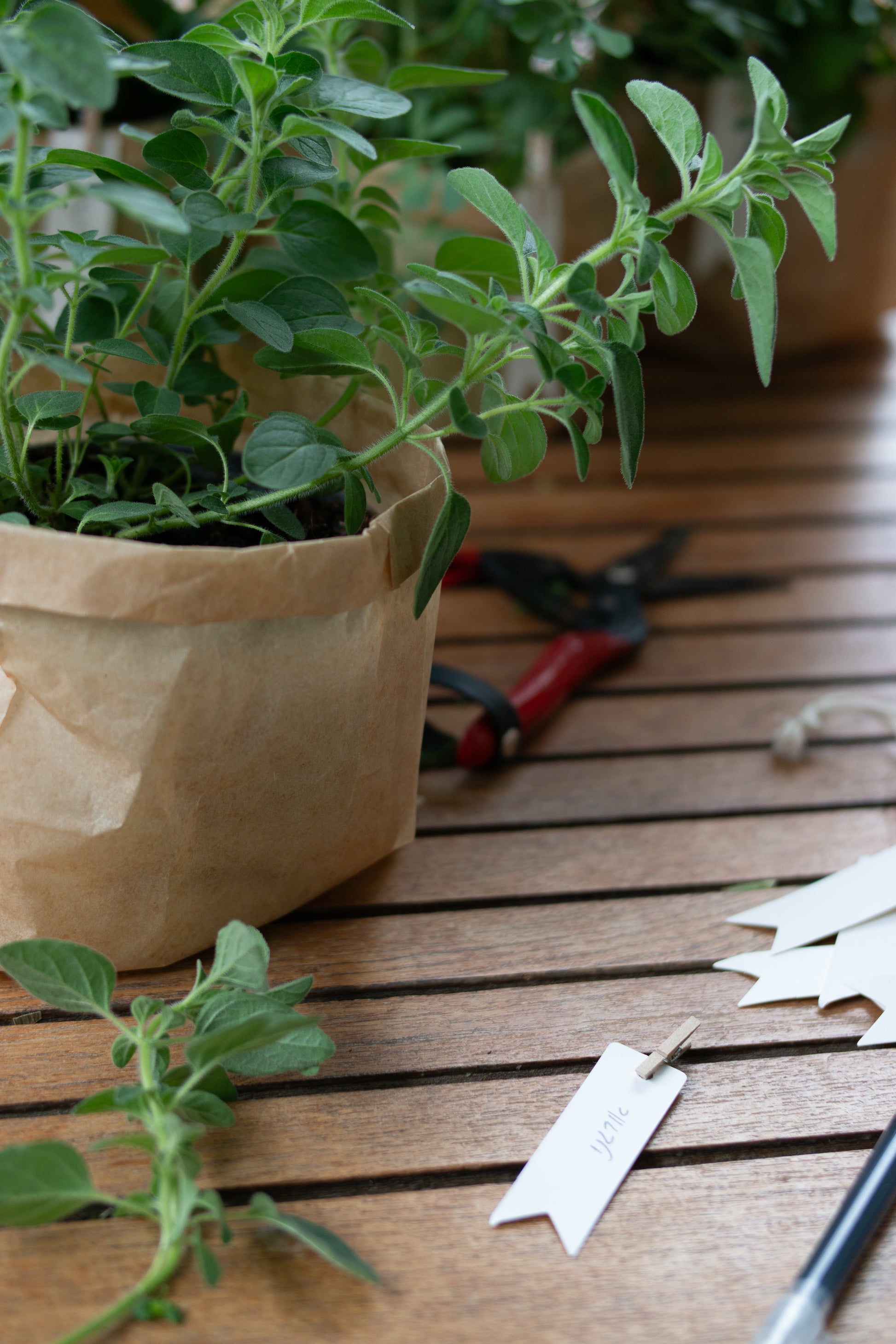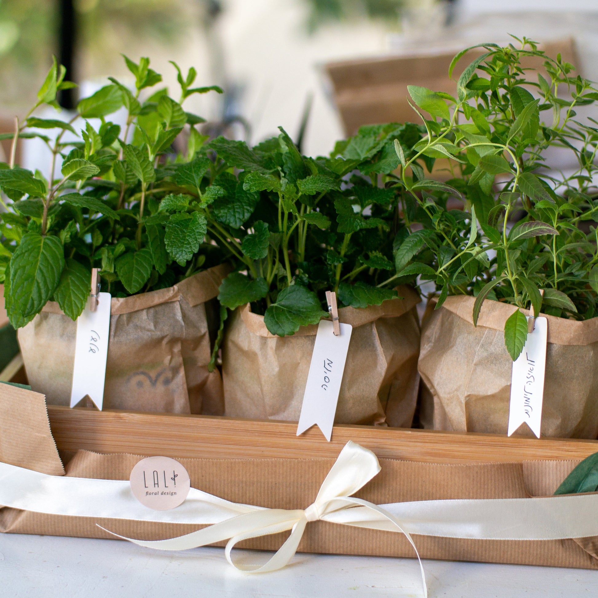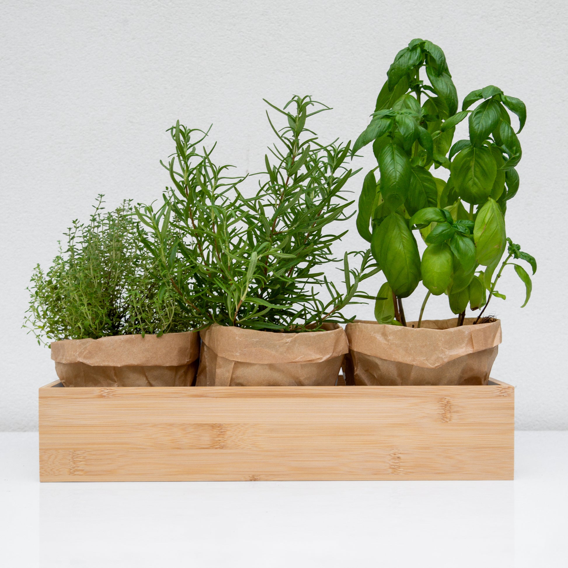 שלושה עציצי עשבי תיבול בקוטר 12 ס״מ לבחירה במגש עץ עם ידית אחיזה