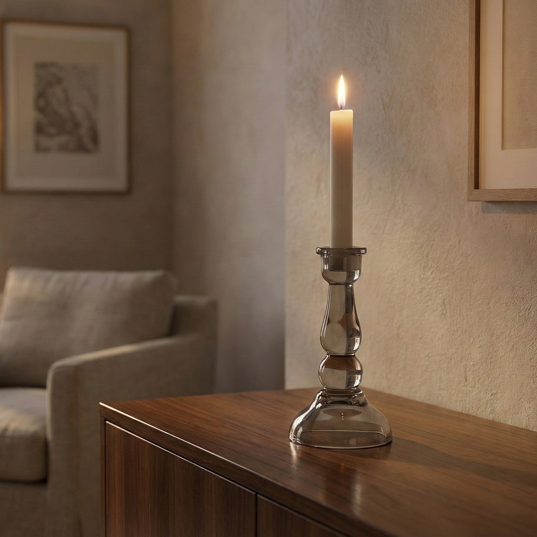 פמוט גבוה שעשוי מזכוכית איכותית בצבע שחור שקפקף, מעוצב בסגנון קלאסי ונקי שיהפוך כל שולחן סעודה לחגיגה ויוסיף סטייל לכל חלל, בעיקר כשמשולב יחד עם נרות ומוצרים נוספים מהקולקציה.