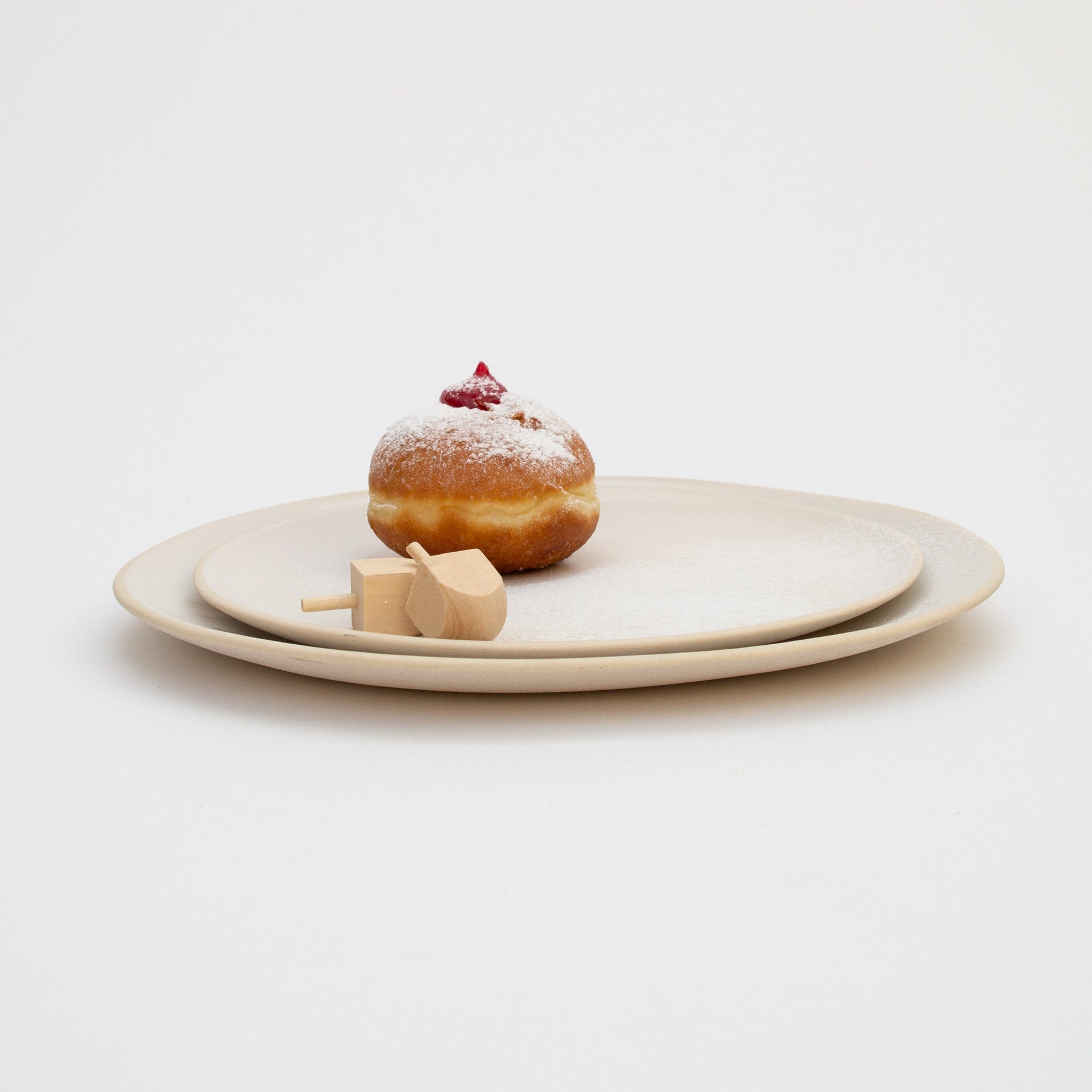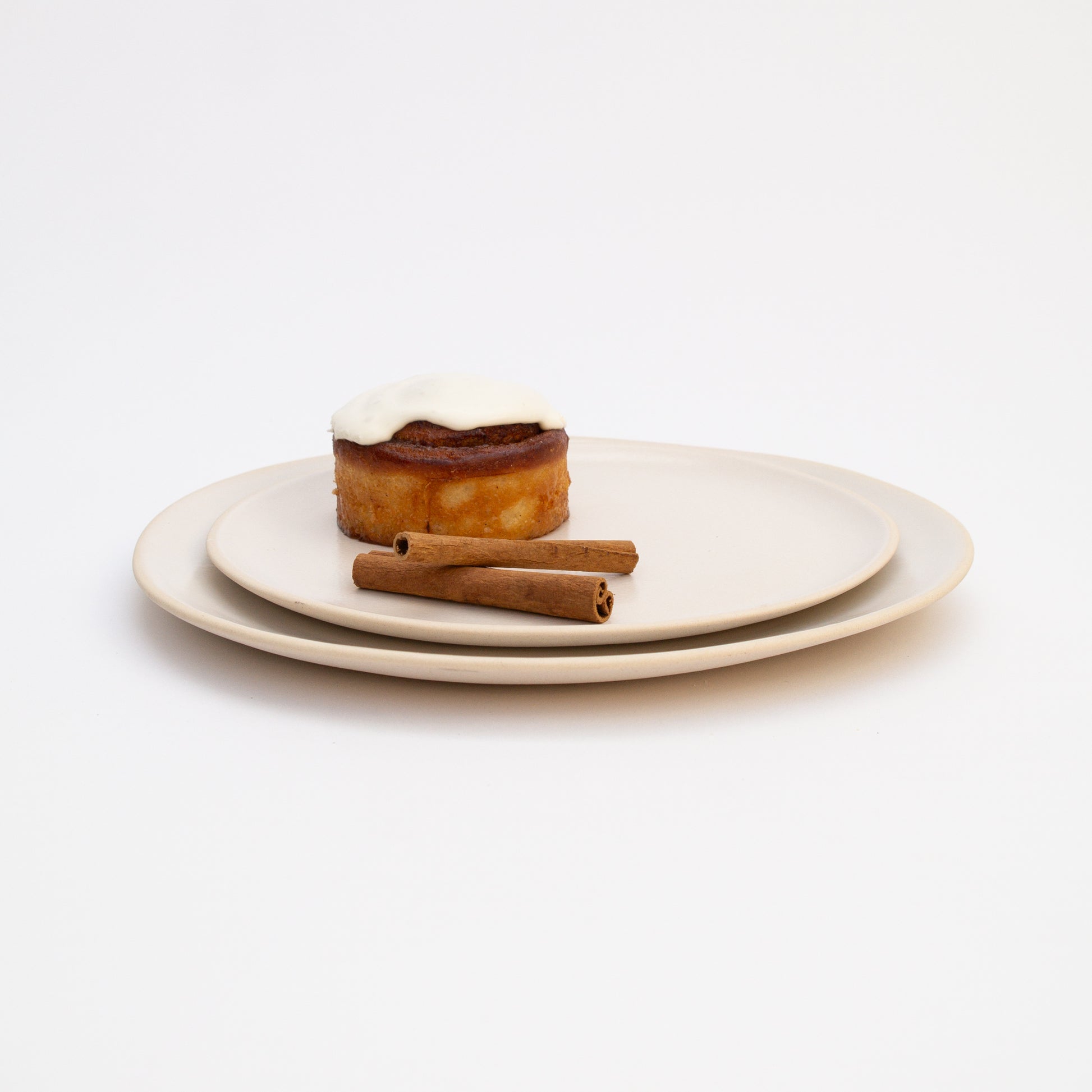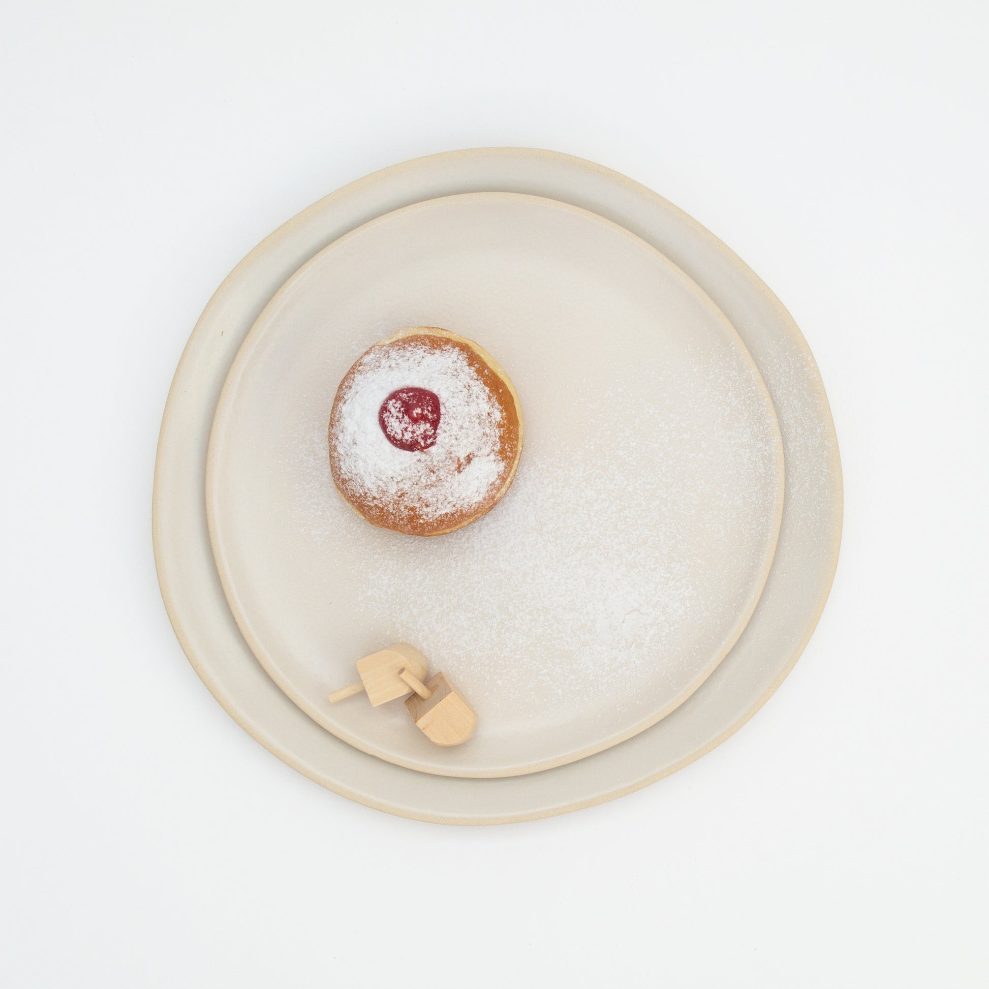 צלחות קרמיקה עגולות בשני גדלים מקרמיקה בצבע לבן אבן עם סיומת שוליים בצבע בז׳