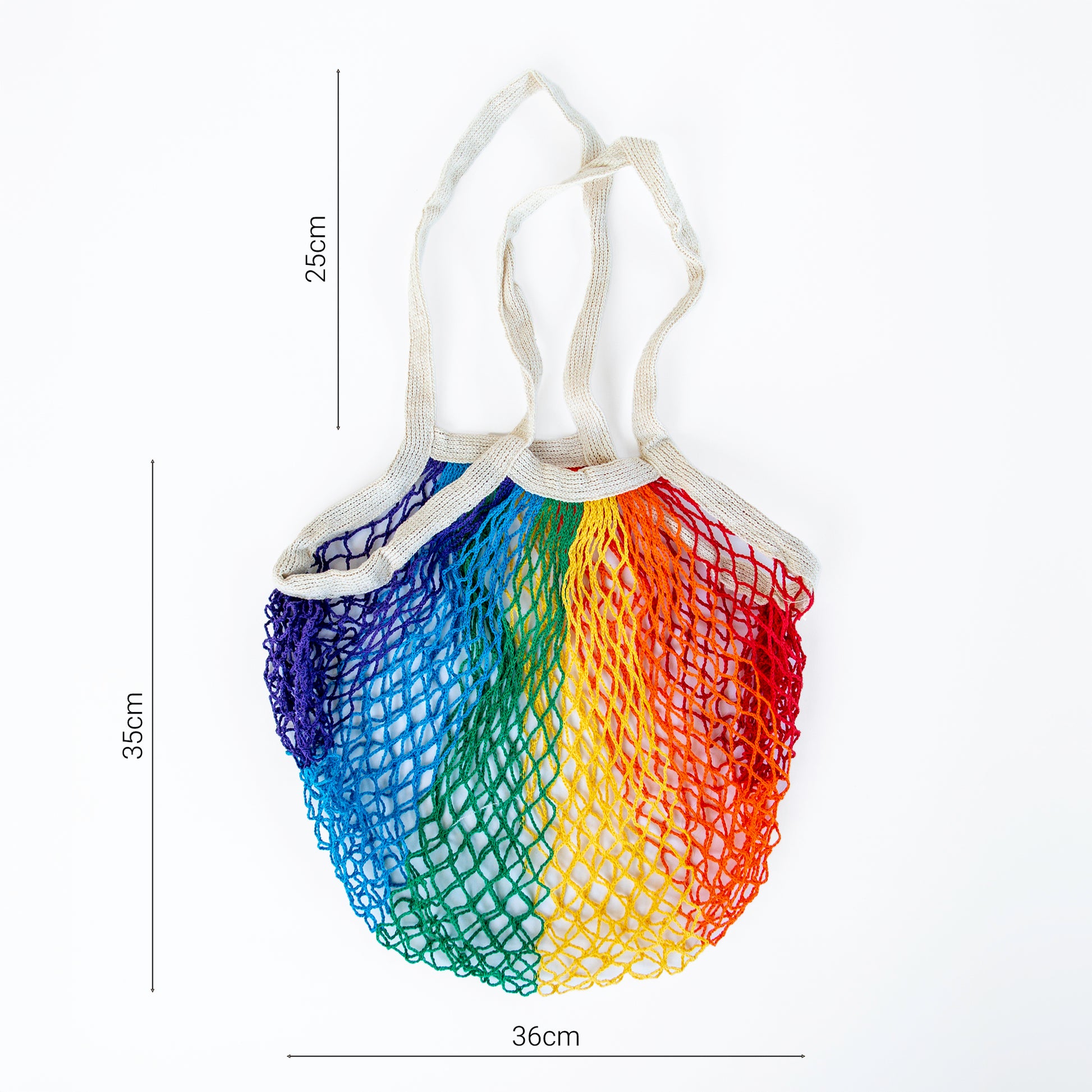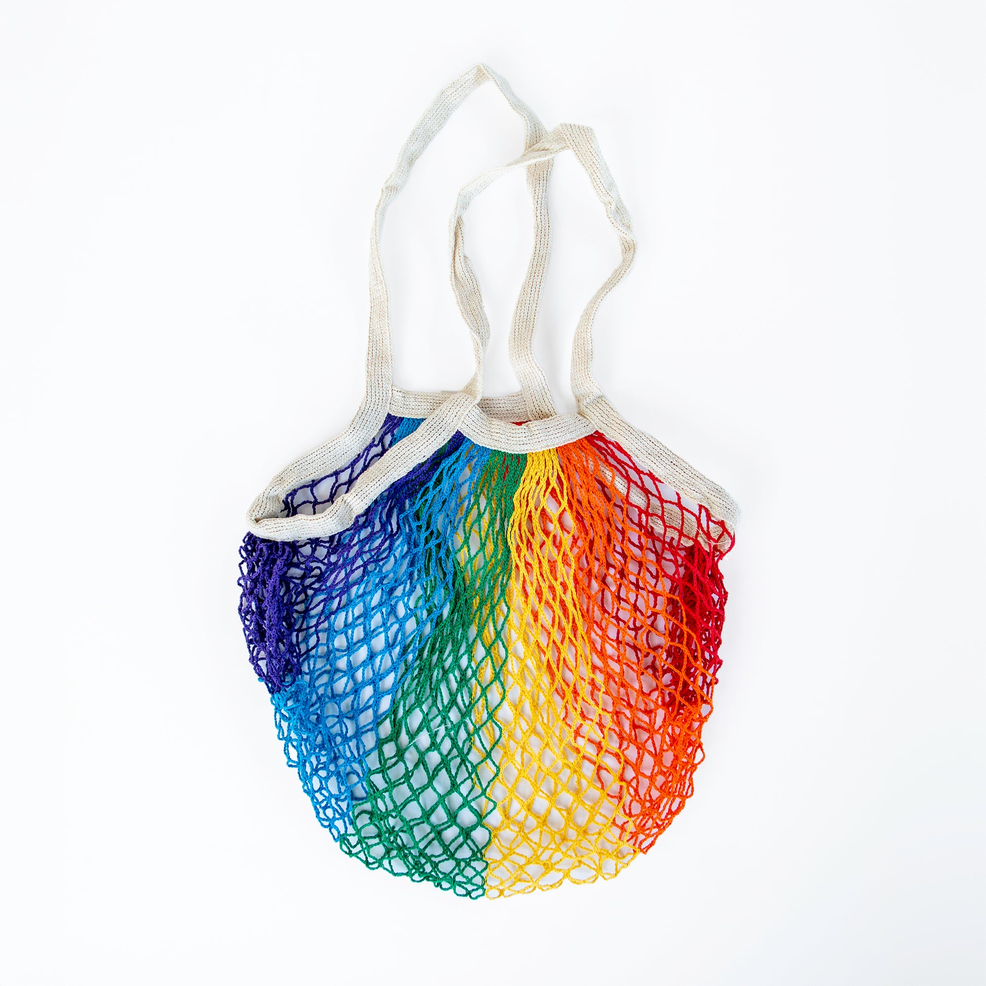 תיק רשת רב־פעמי בגווני קשת, עם ידיות ארוכות לנשיאה נוחה על הכתף. עמיד, נושם וקל משקל, אידיאלי לקניות יומיומיות, טיולים לים, פיקניקים או לשימוש בבית כפתרון אחסון מעוצב. אלטרנטיבה אקולוגית לשקיות חד־פעמיות, עם מראה טרנדי ומיוחד.