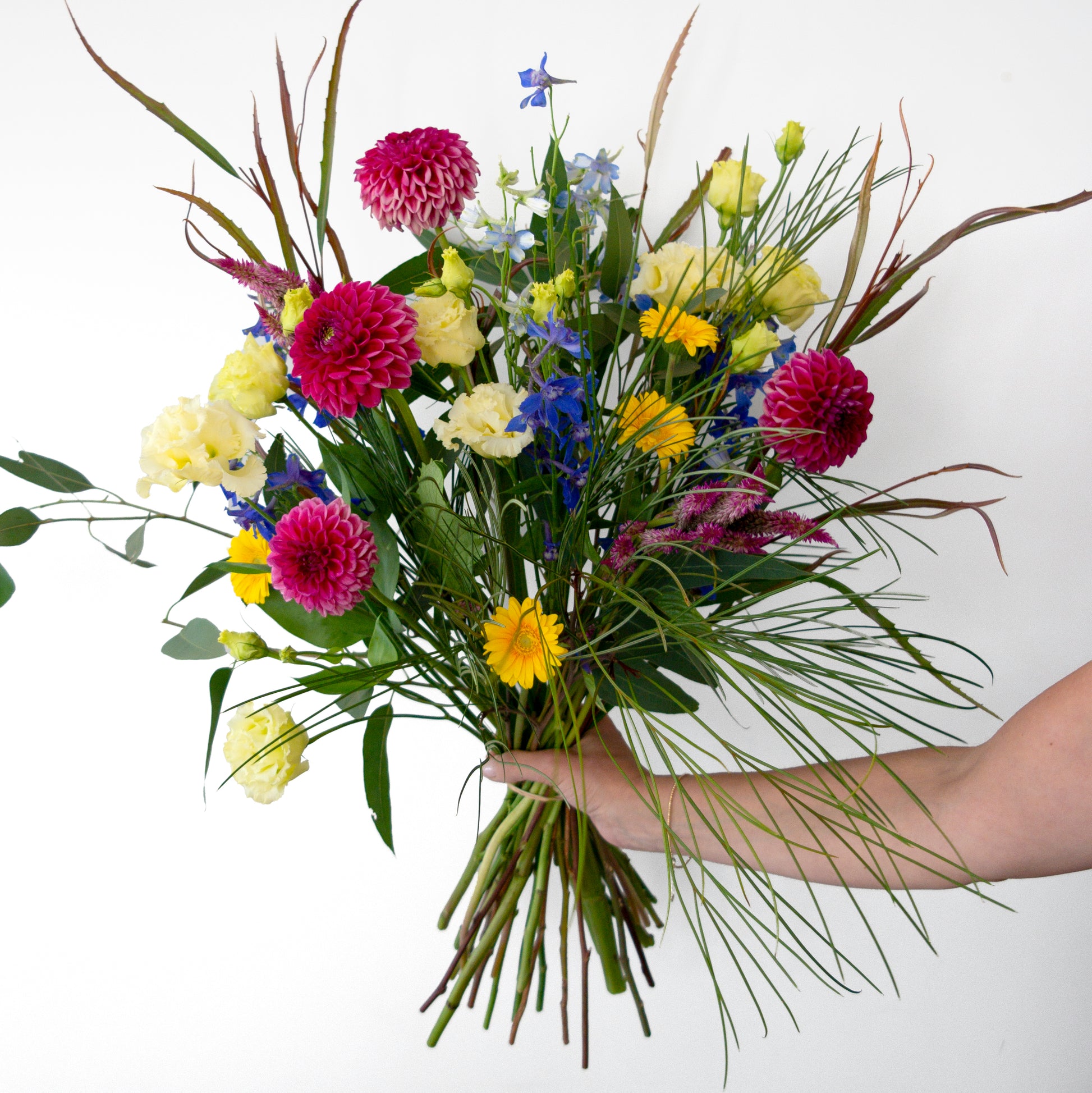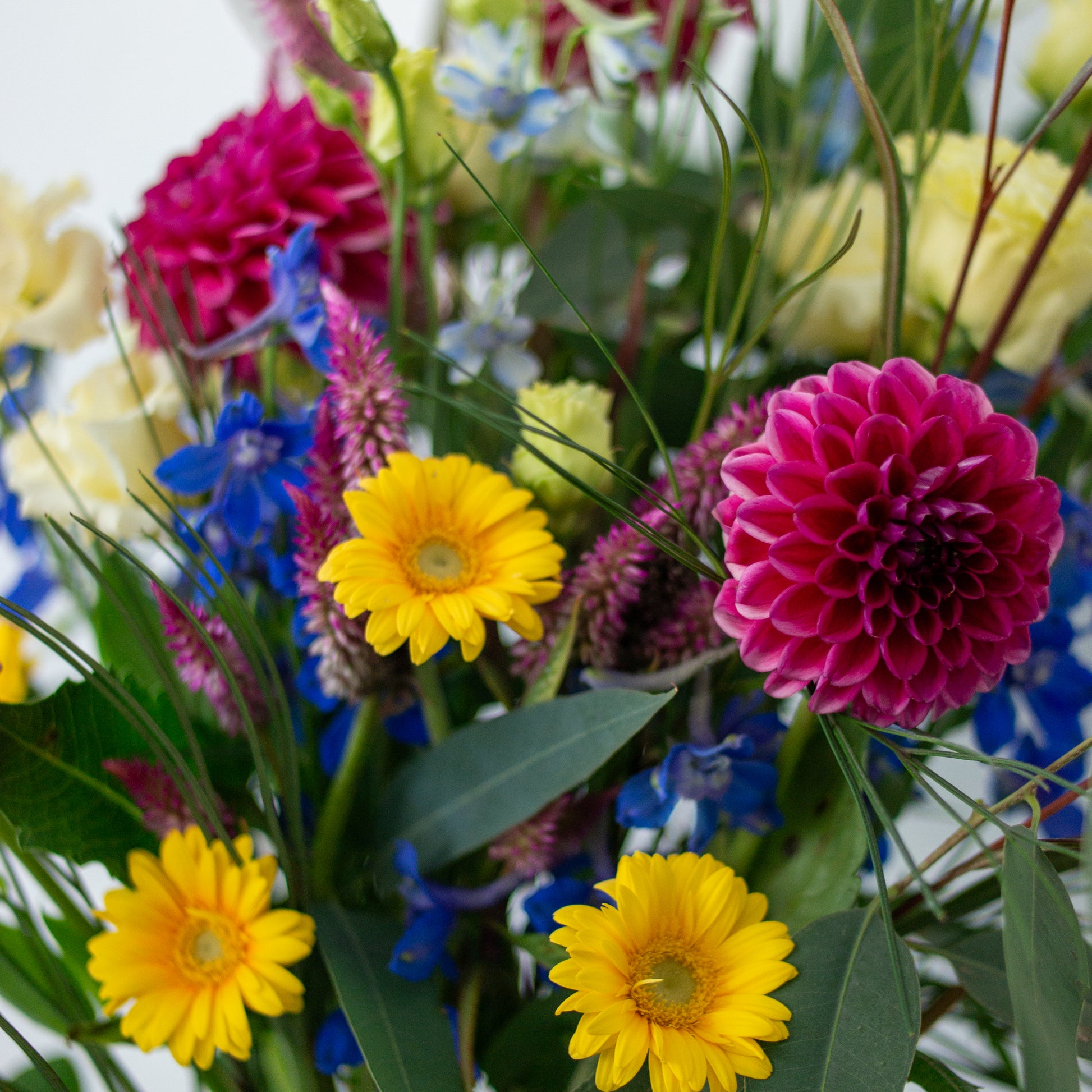 זר בסגנון חופשי הכולל דהליה, ליזיאנטוס, דולפיניום, צלוזיה, גרברה מיקרו ושלל ירוקים