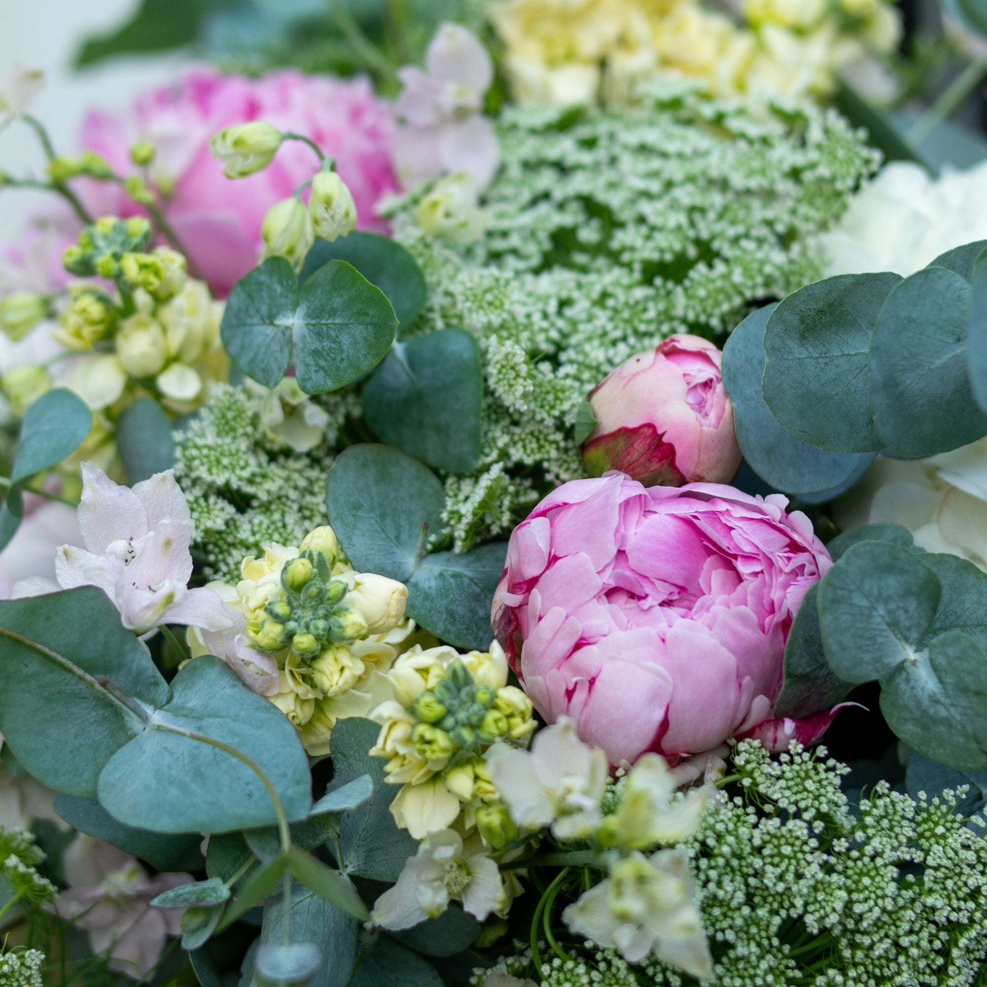 זר בסגנון חופשי הכולל הורטנזיה, פיוני, מנתור, דולפיניום, אמיתה ואקליפטוס פרובלנטה